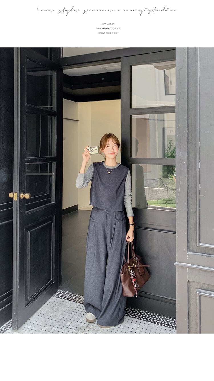 これだけで即コーデが完成!カットソー+ベスト+ワイドパンツのセットアップ。