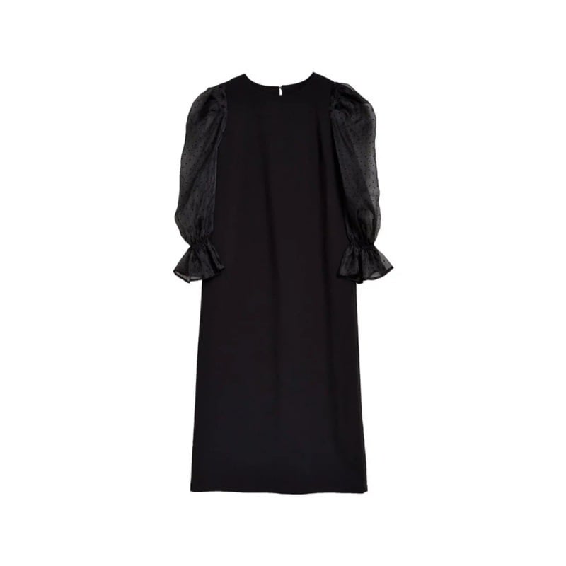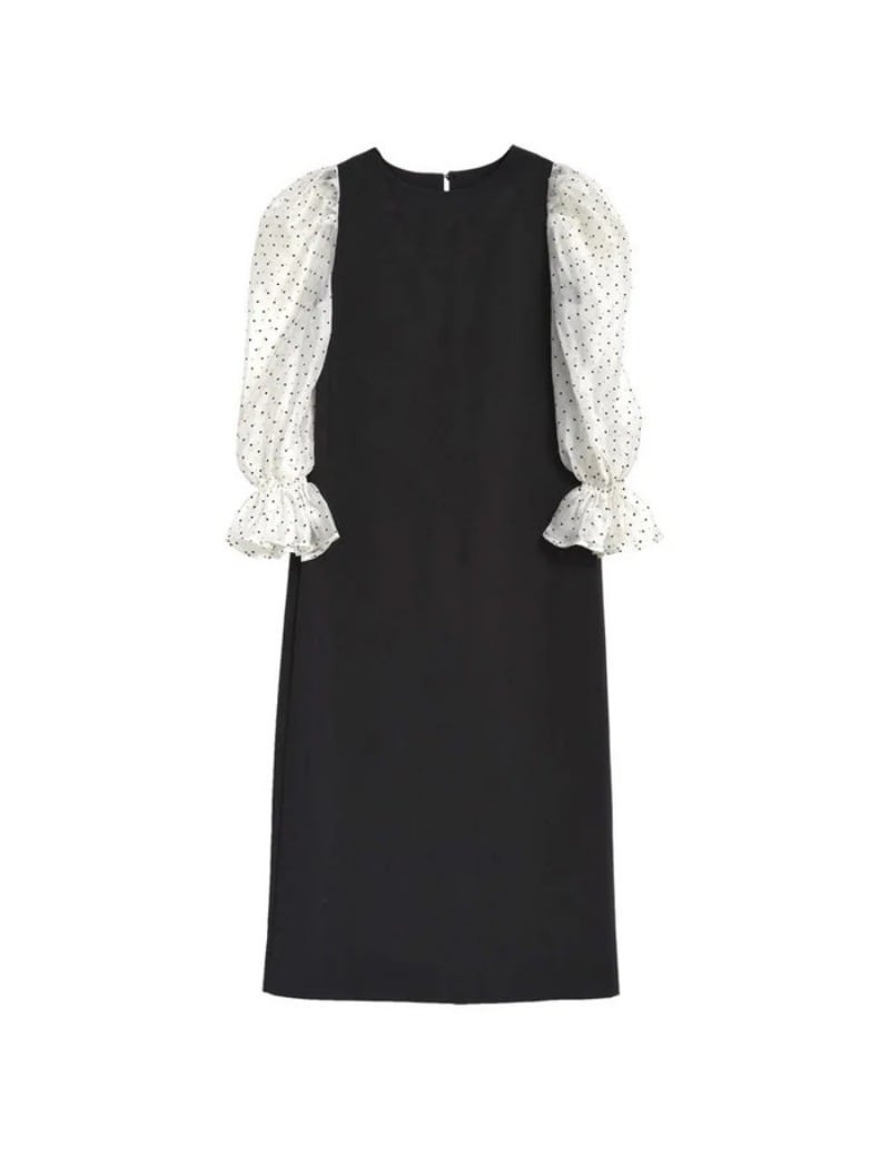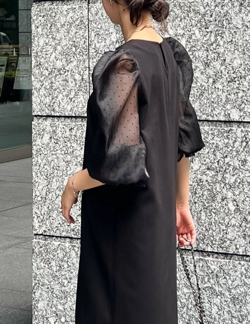 シースルーのお袖が大人可愛いドット柄のパーティードレス。