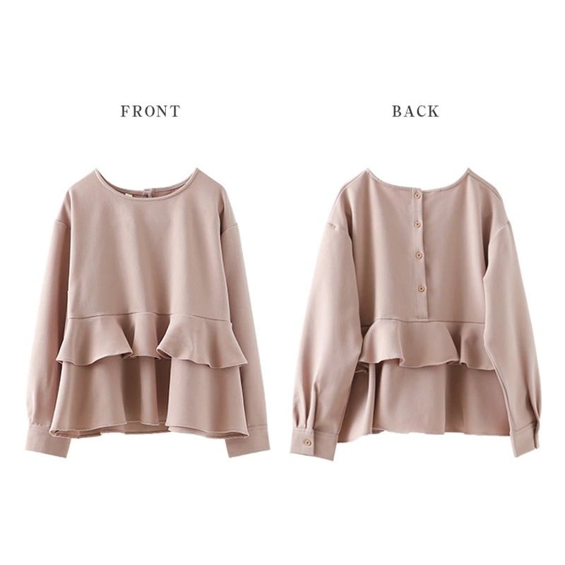 バックにはボタン使いで大人の可愛らしさをプラス。