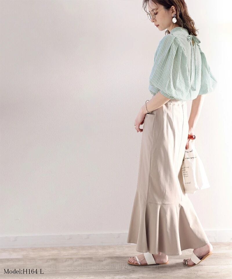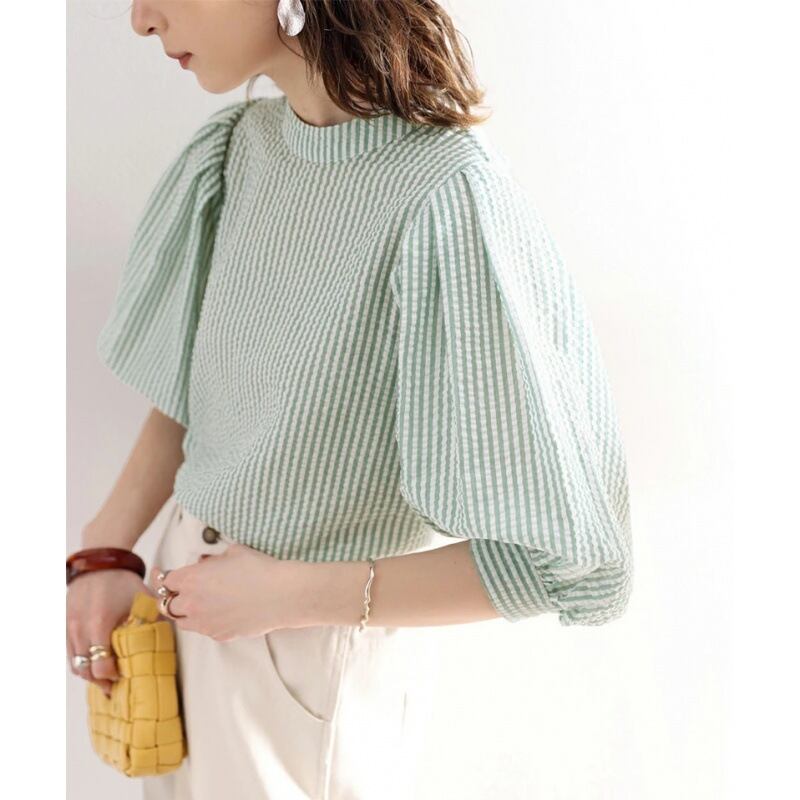 ボリューミーなお袖が女性らしいストライプ柄のブラウス。