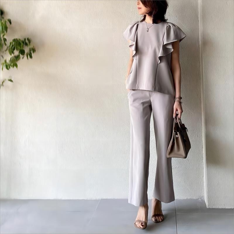 大人エレガントなフリルトップス+パンツのセットアップ。