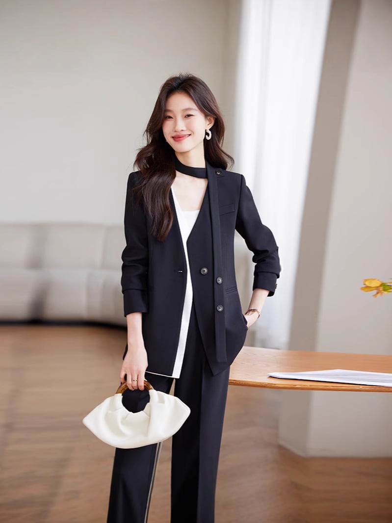 大人かっこいいノーカラージャケット+パンツのセットアップ。