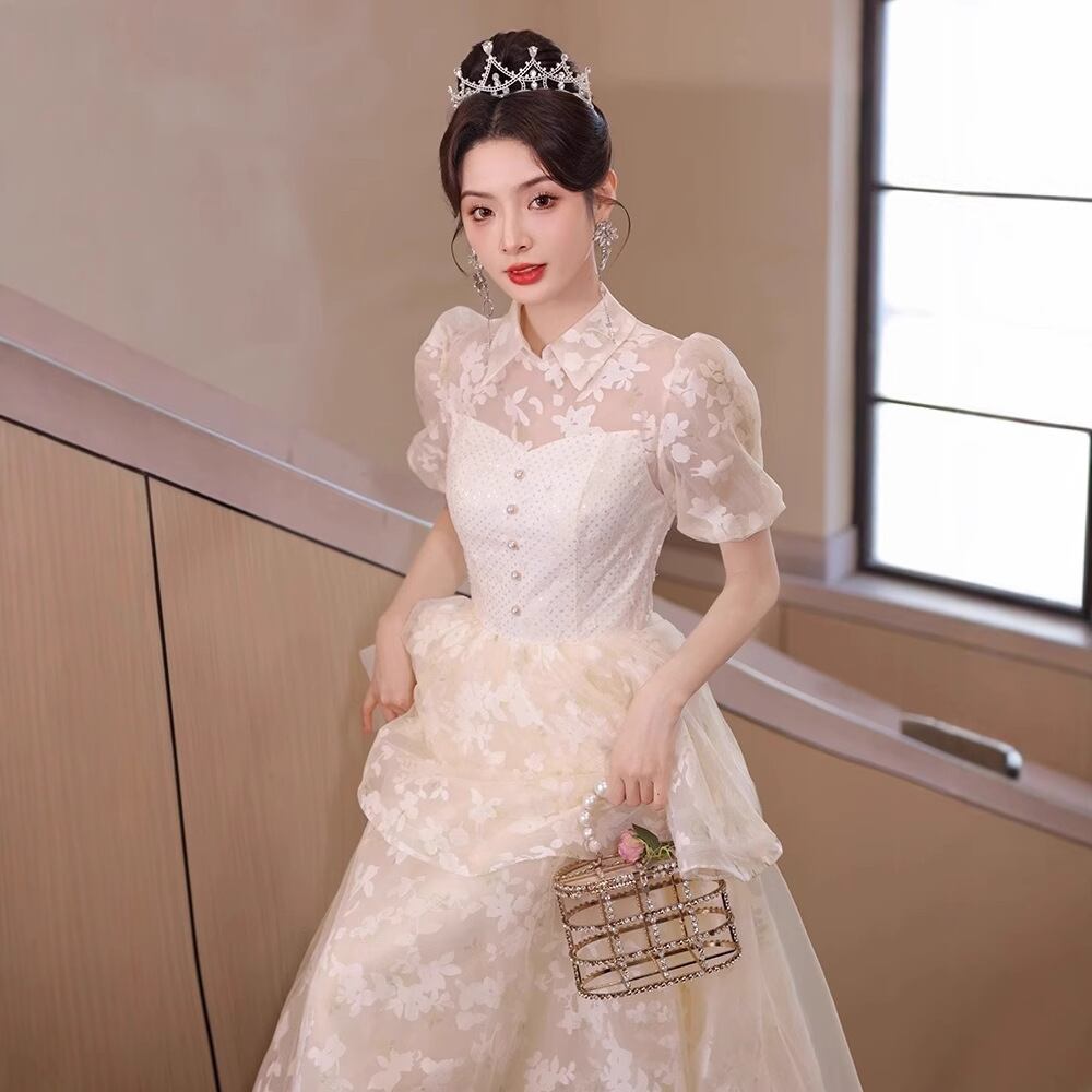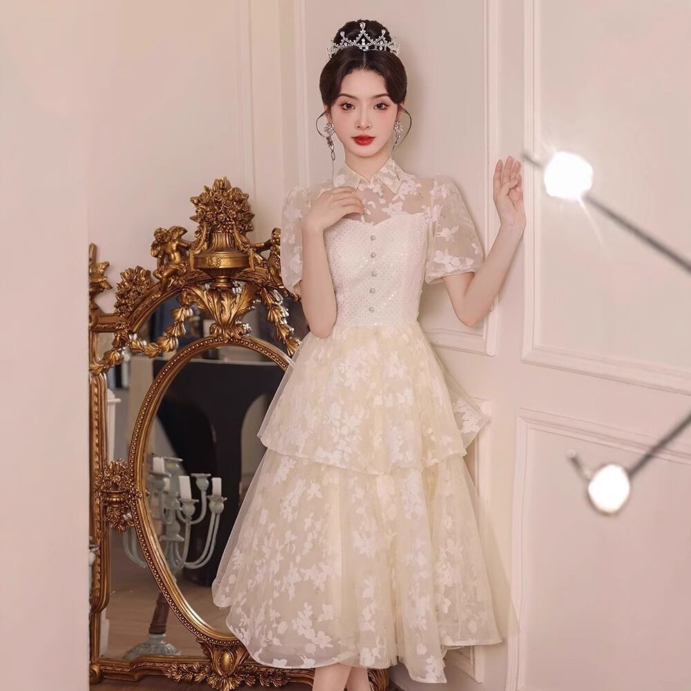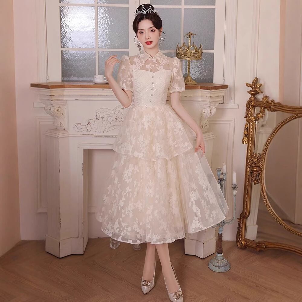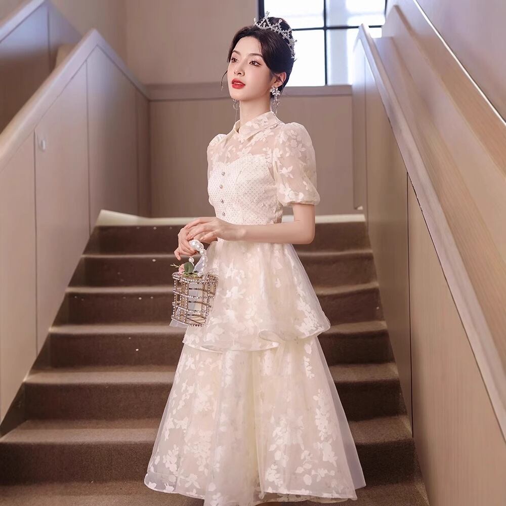 大人可愛いシャンパンカラーのティアードパーティードレス。