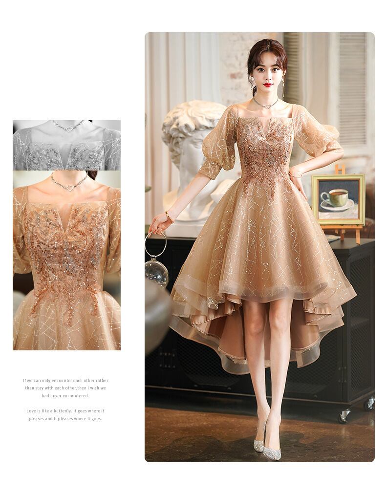 胸元のスパンコールがきらきら輝きパフスリーブが女性らしさを引き立てる。