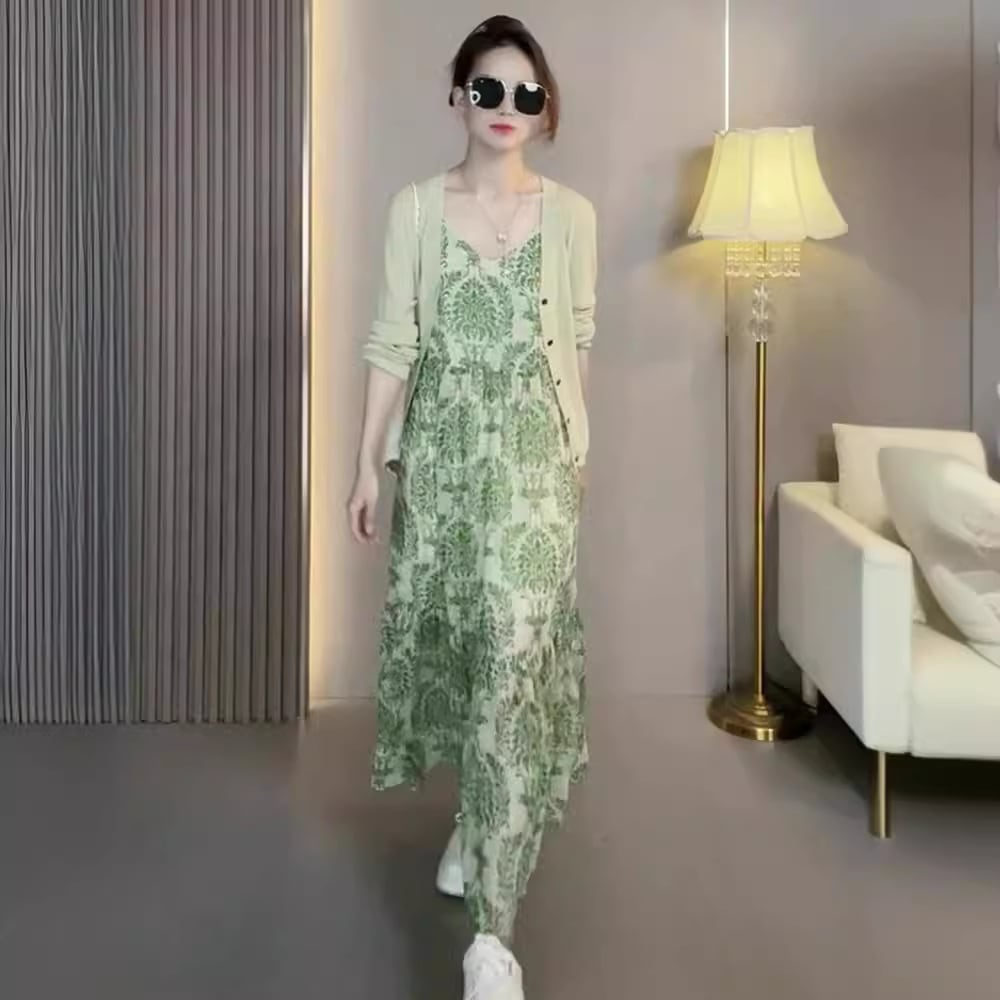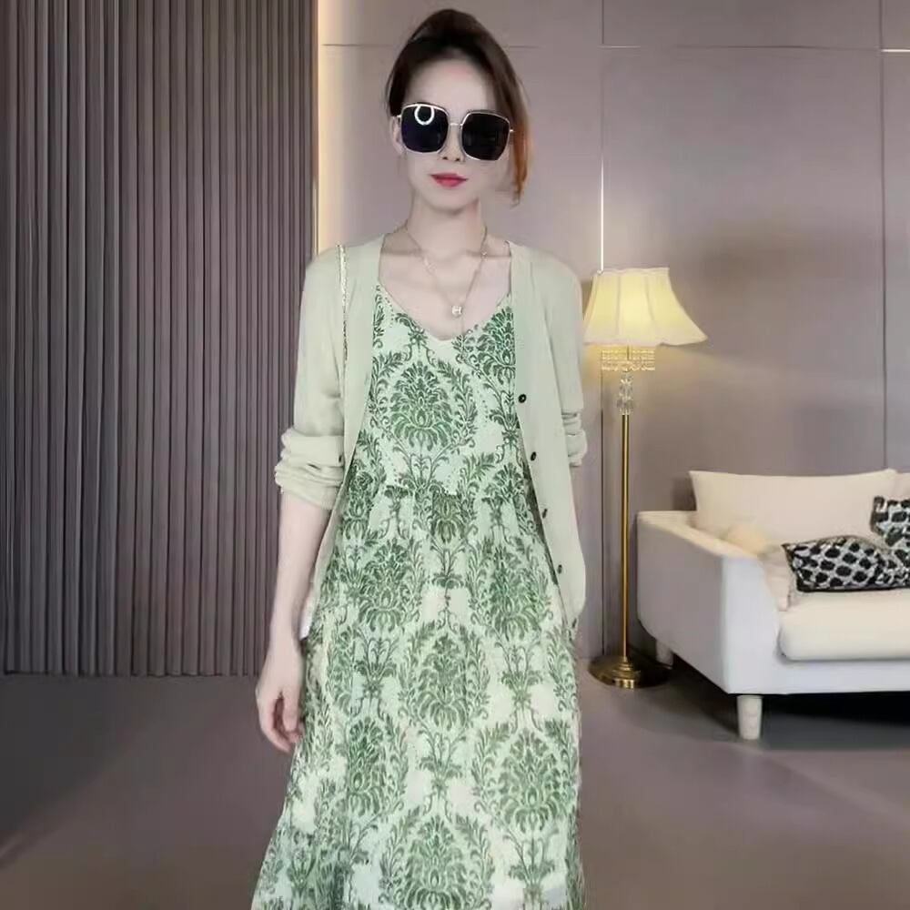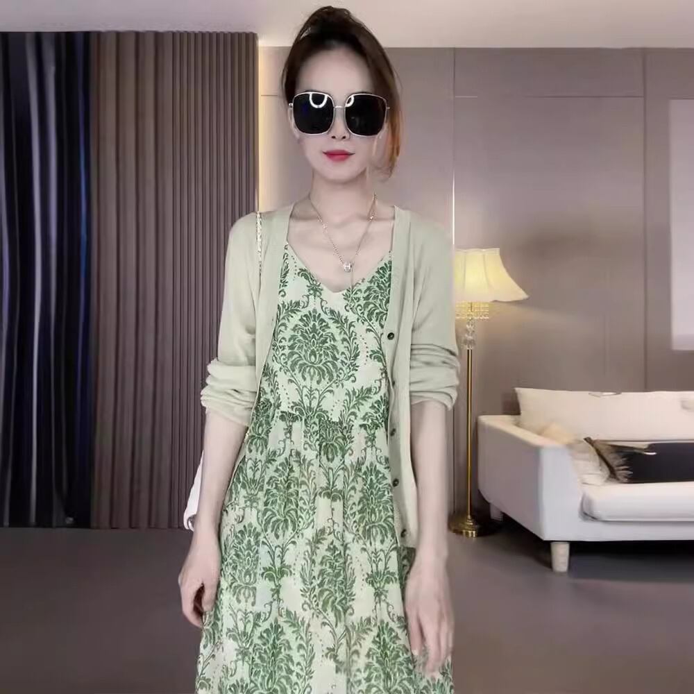 大人可愛いボタニカルワンピース+カーディガンのセットアップ。