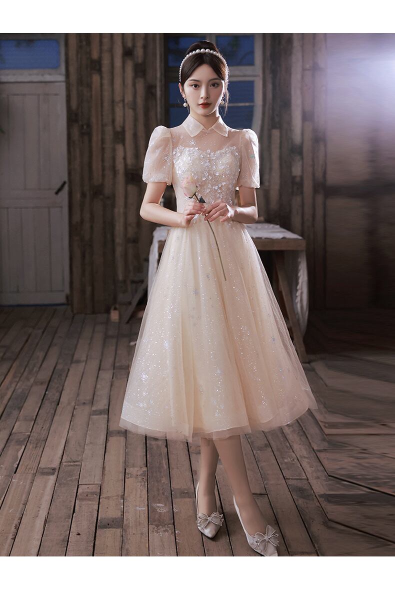 襟付きのきらびやかなパーティードレス。