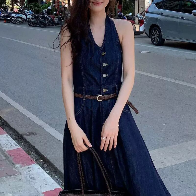 日常使いにおすすめ!ホルターネックのデニムワンピース。
