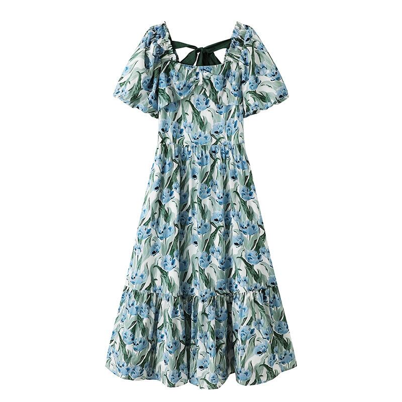 バックリボンが大人可愛いボタニカル柄のワンピース。