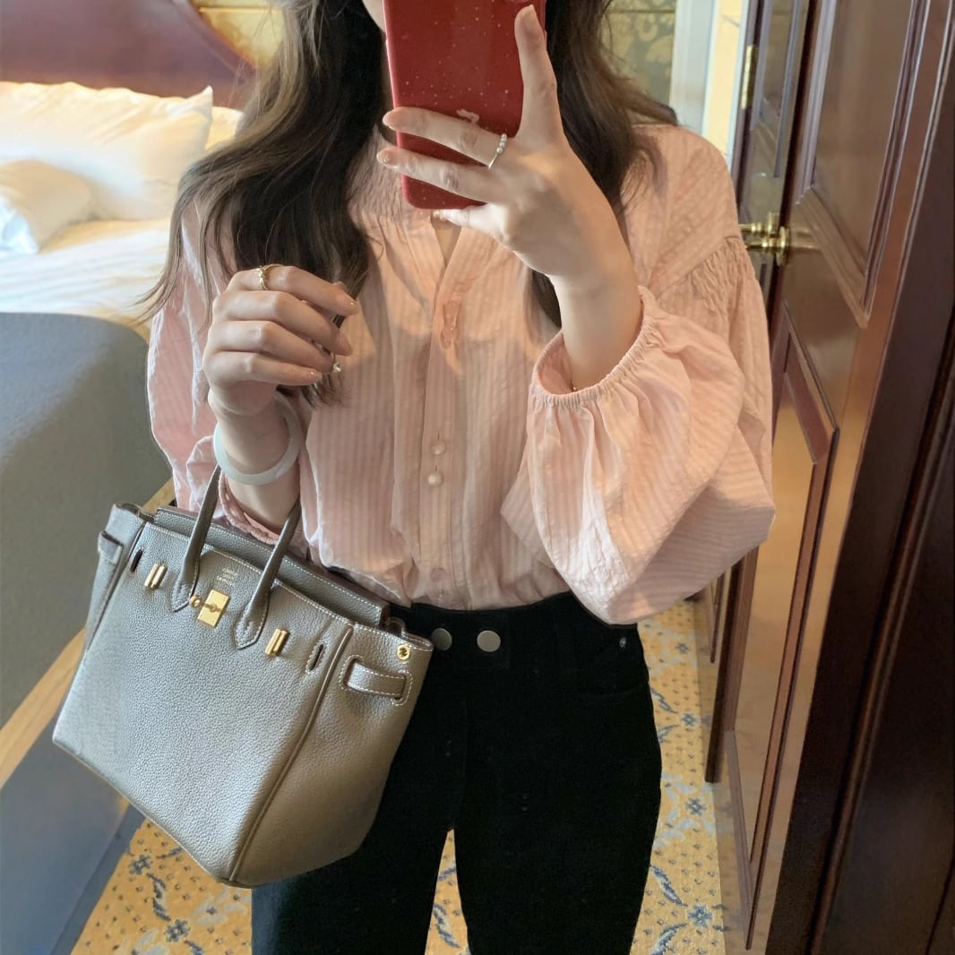 大人可愛いストライプ柄のパフスリーブブラウス。