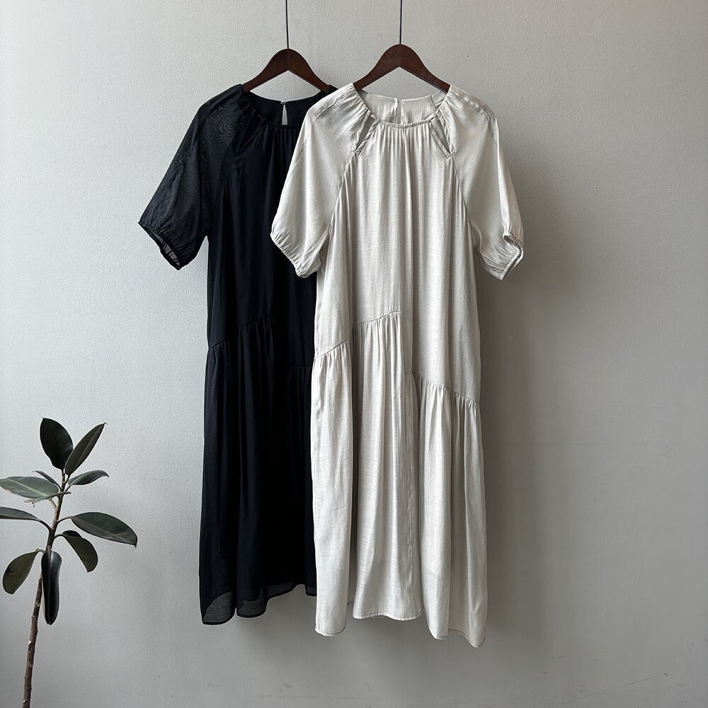 さらさらとした生地感のアシンメトリー切り替えのワンピース。