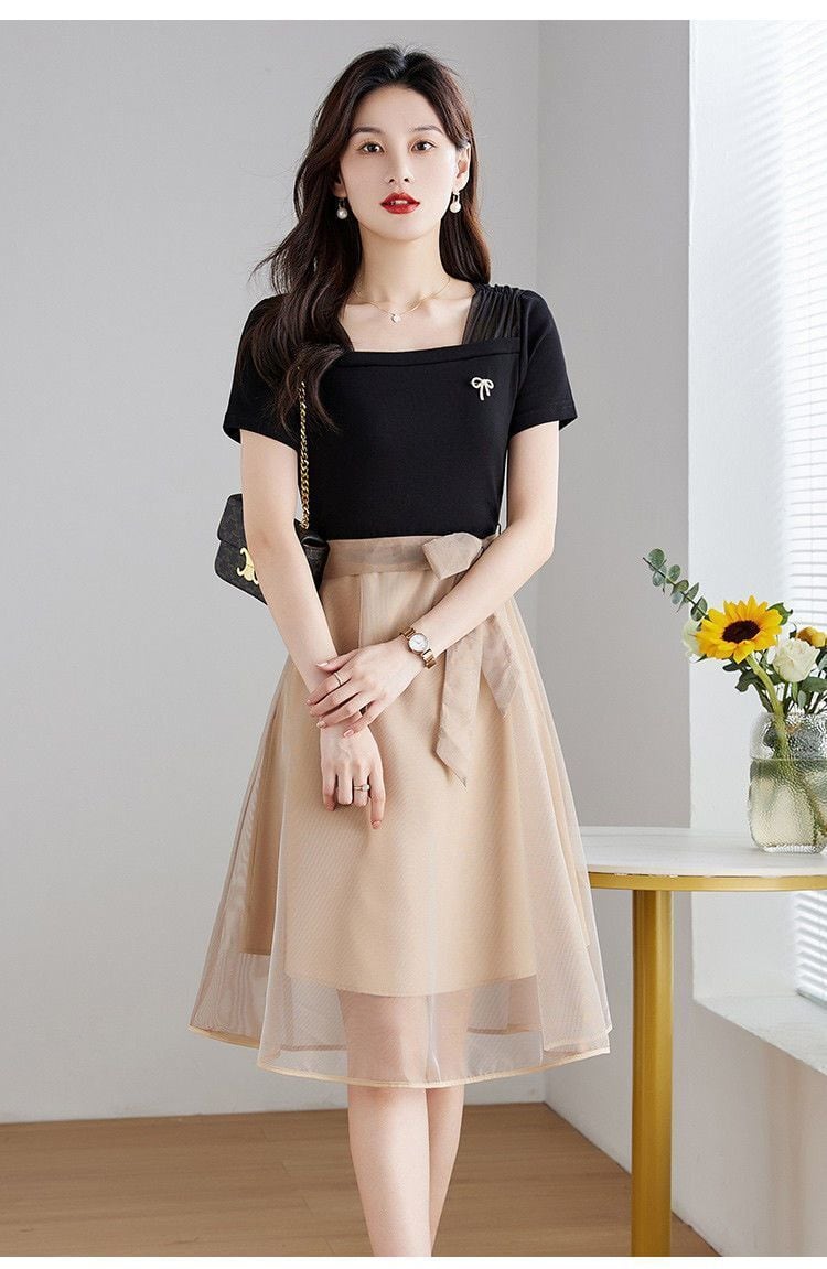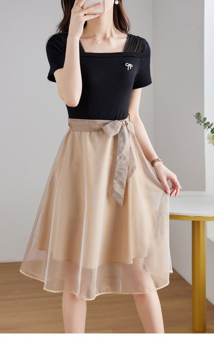 ハイウエストのリボン切り替えで腰まわりのすっきり細見せ効果も。