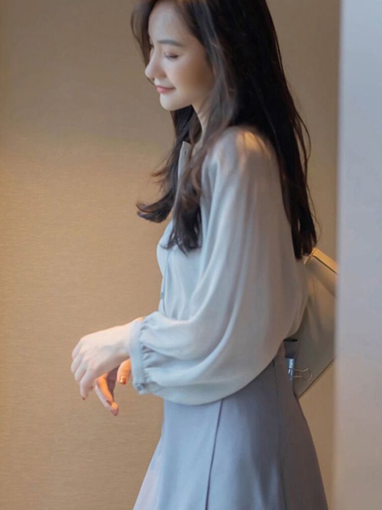 【ブラウス】 ブラウス レディース 大人 可愛い トップス シャツ ブラウス 韓国 ブラウス 春 夏 秋 20代 30代 40代 シンプル シフォン オフィス レディース 長袖 フォーマル 体型カバー きれいめ グレーブルー 青 S M L XL
