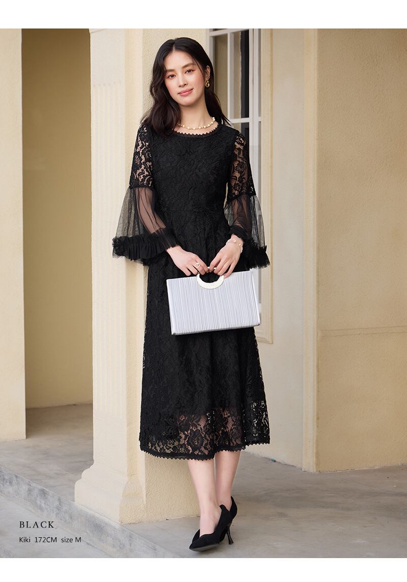 シースルーのフレアスリーブが存在感あり大人の女性を演出。