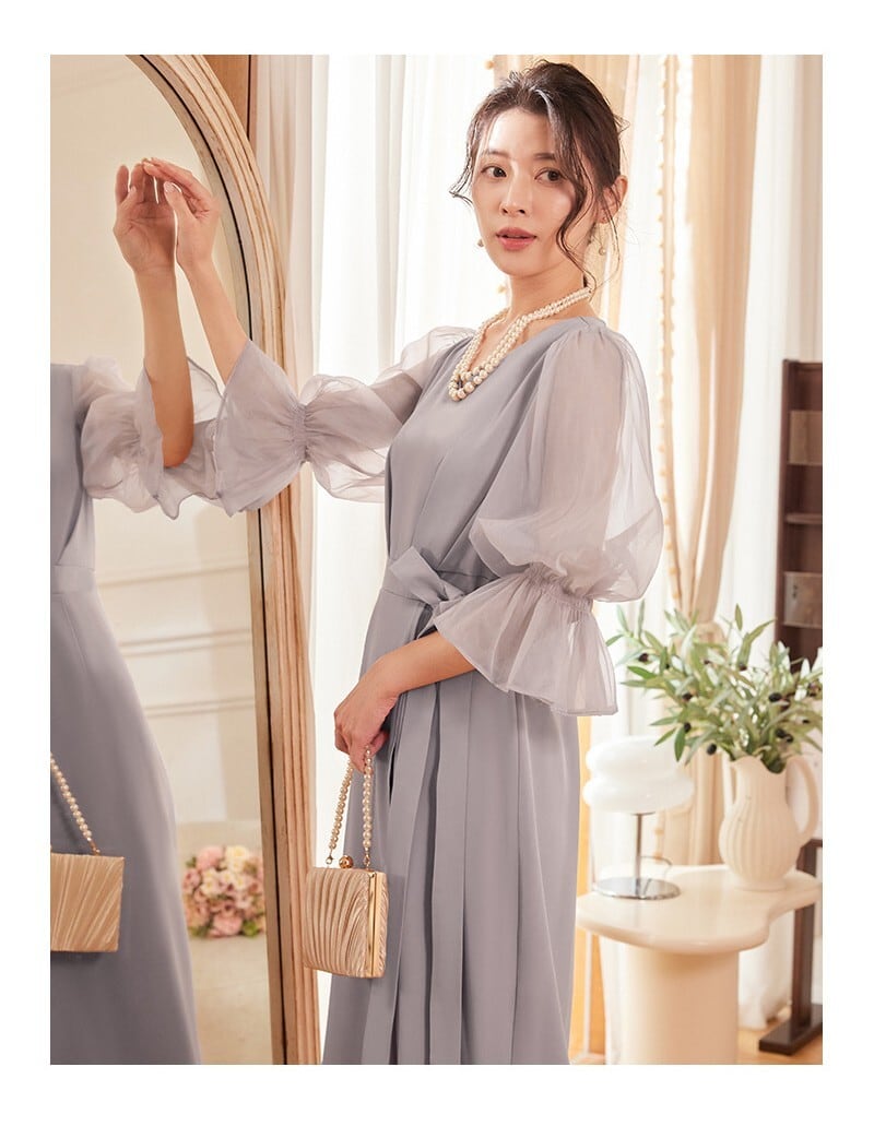 シアーなボリューミー袖とウエストのリボンが可愛らしいパーティードレス。