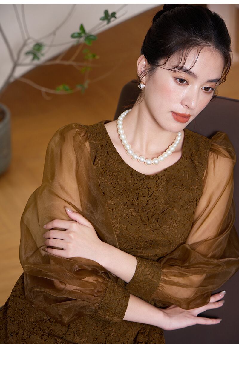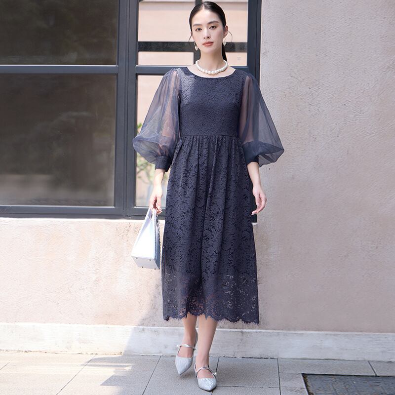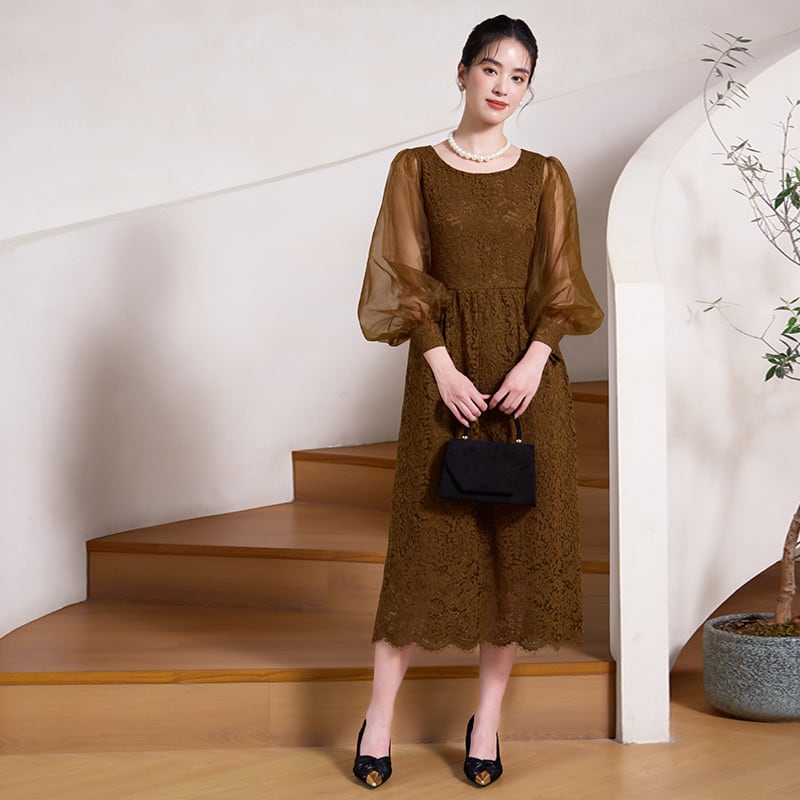 レースステッチがエレガントなパフスリーブのパーティードレス。