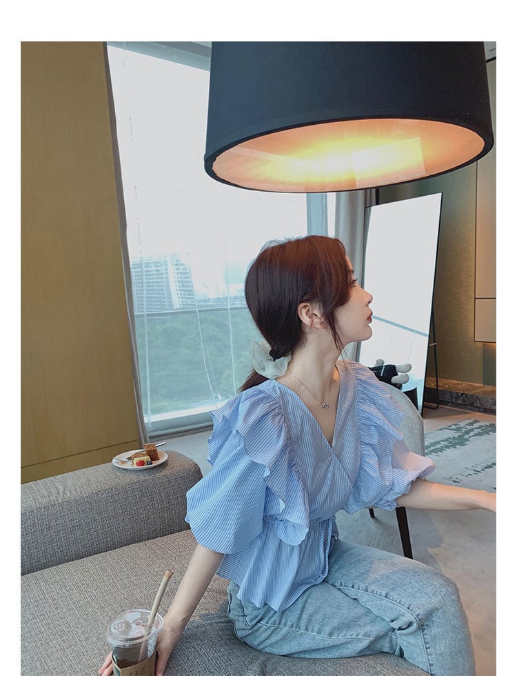 大きなフリルが大人可愛いストライプ柄ブラウス。