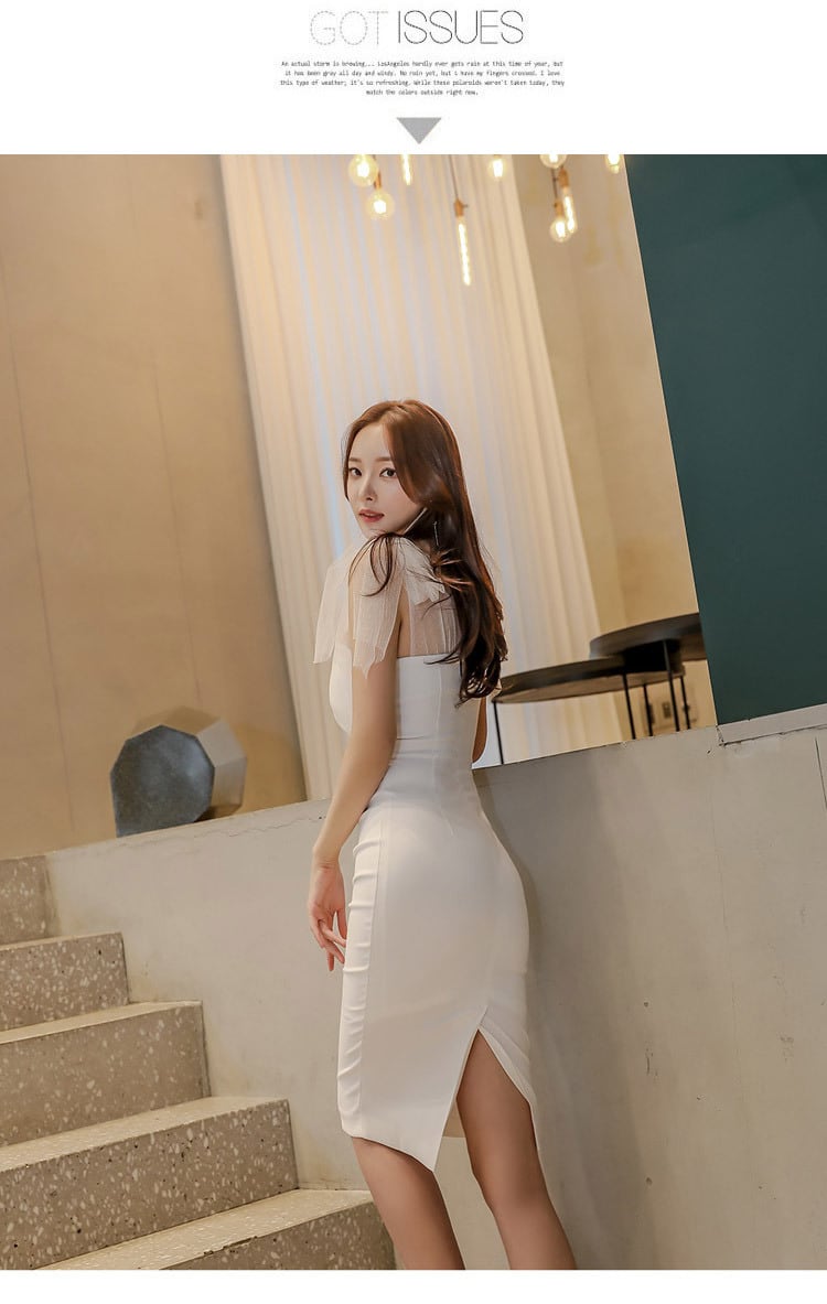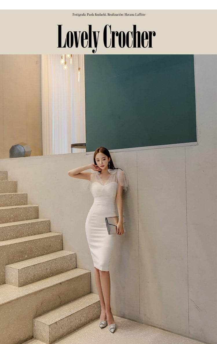 シースルーの肩のおリボンが女性らしくフェミニンな一着。