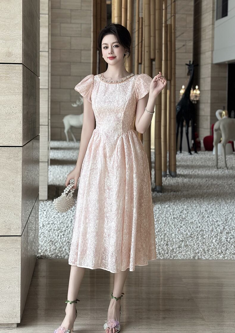 全身にほどこされたお花モチーフが大人可愛いパーティードレス。