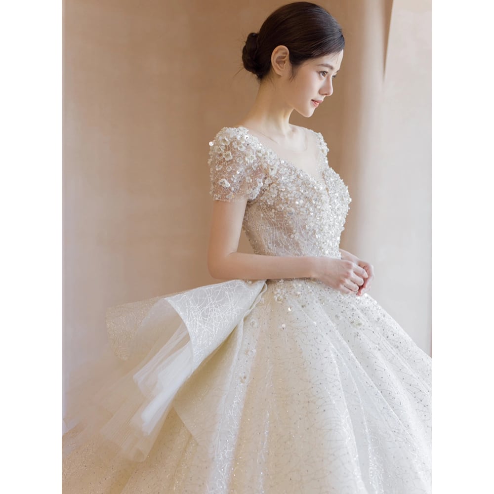 細部にまでほどこされたスパンコールがエレガントなウェディングドレス。