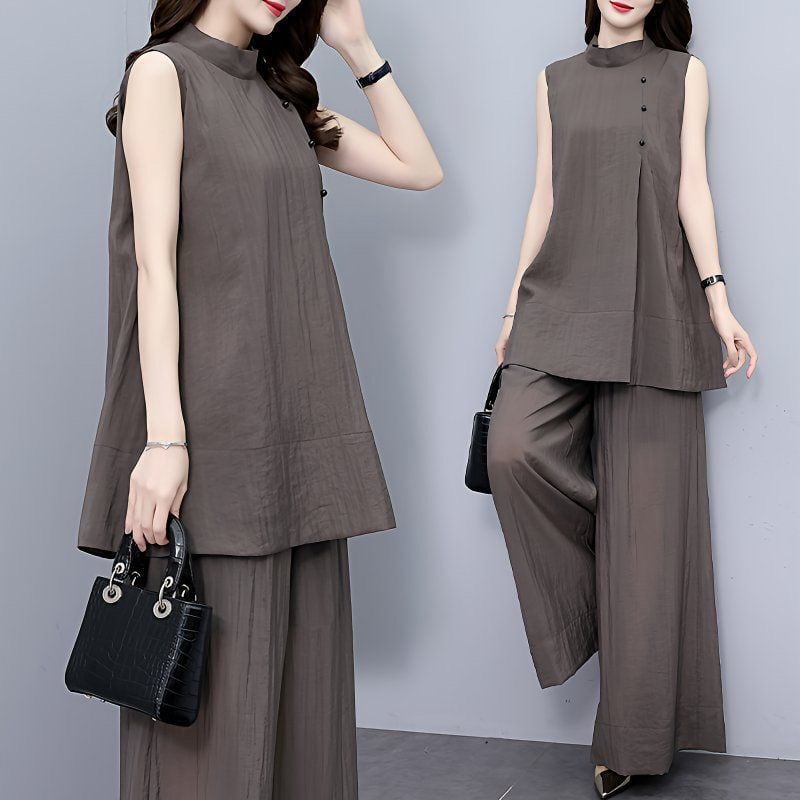 大人エレガントなハイネックトップス+ワイドパンツのセットアップ。