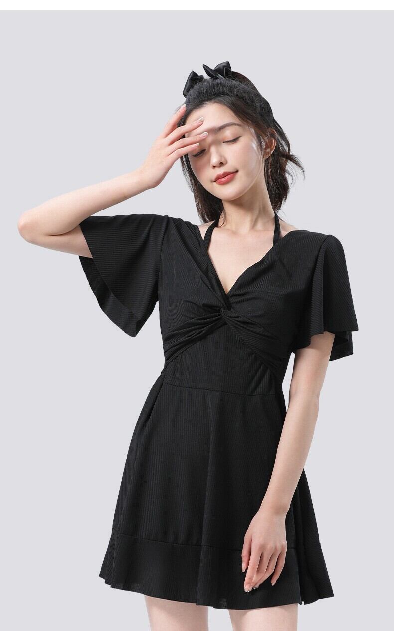 深いvネック&ホルターネックでバストラインを美しく盛る。