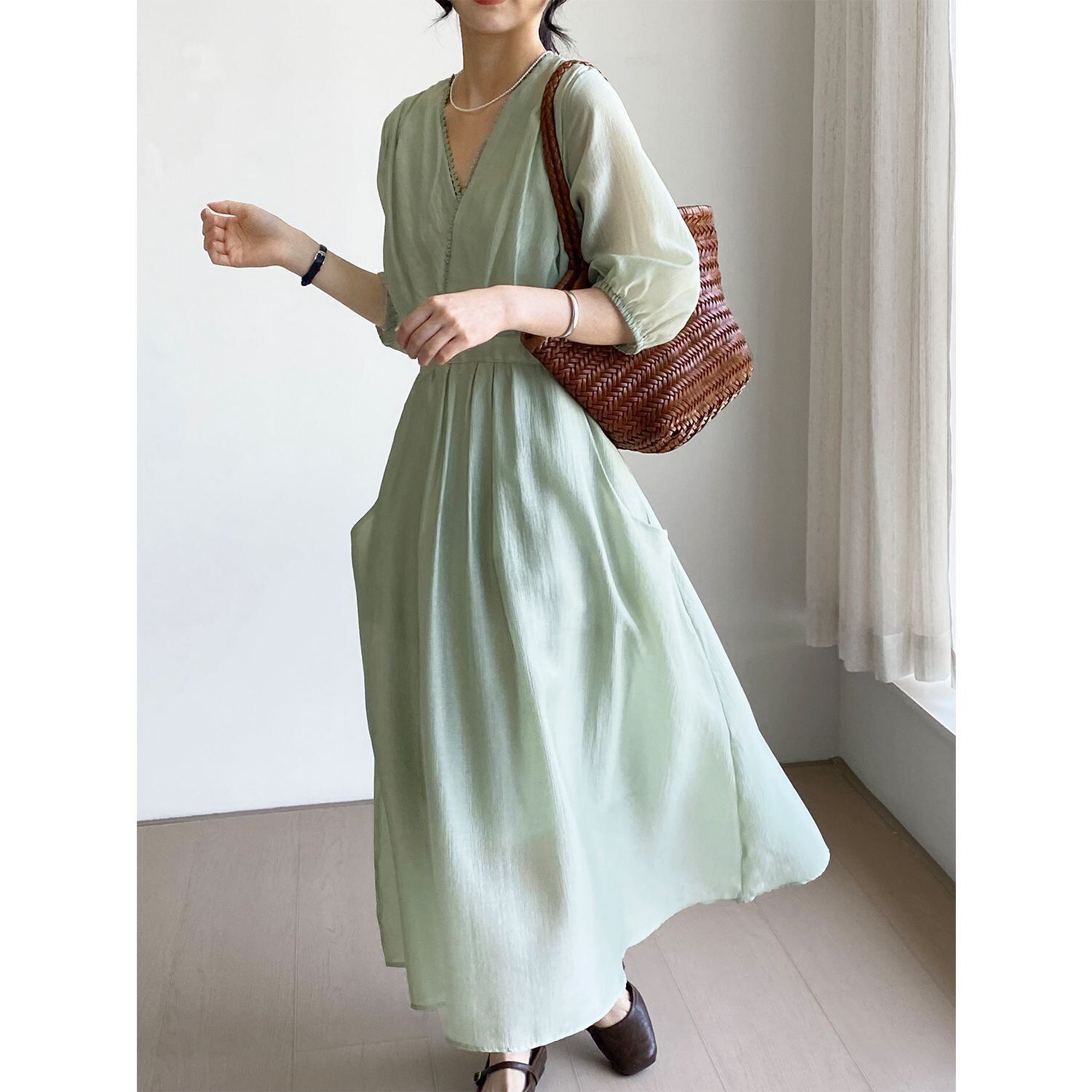 【ワンピース】 ワンピース レディース おしゃれ きれいめ 可愛い 春 夏 秋 ワンピース 20代 30代 40代 ロング ワンピース 韓国 ワンピース 袖あり グリーン 緑 ピンク