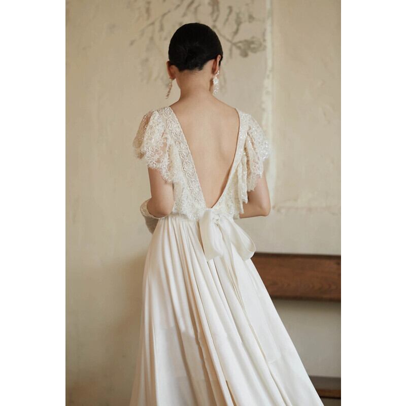 深いvネックのオープンバックな後ろ姿のウェディングドレス。