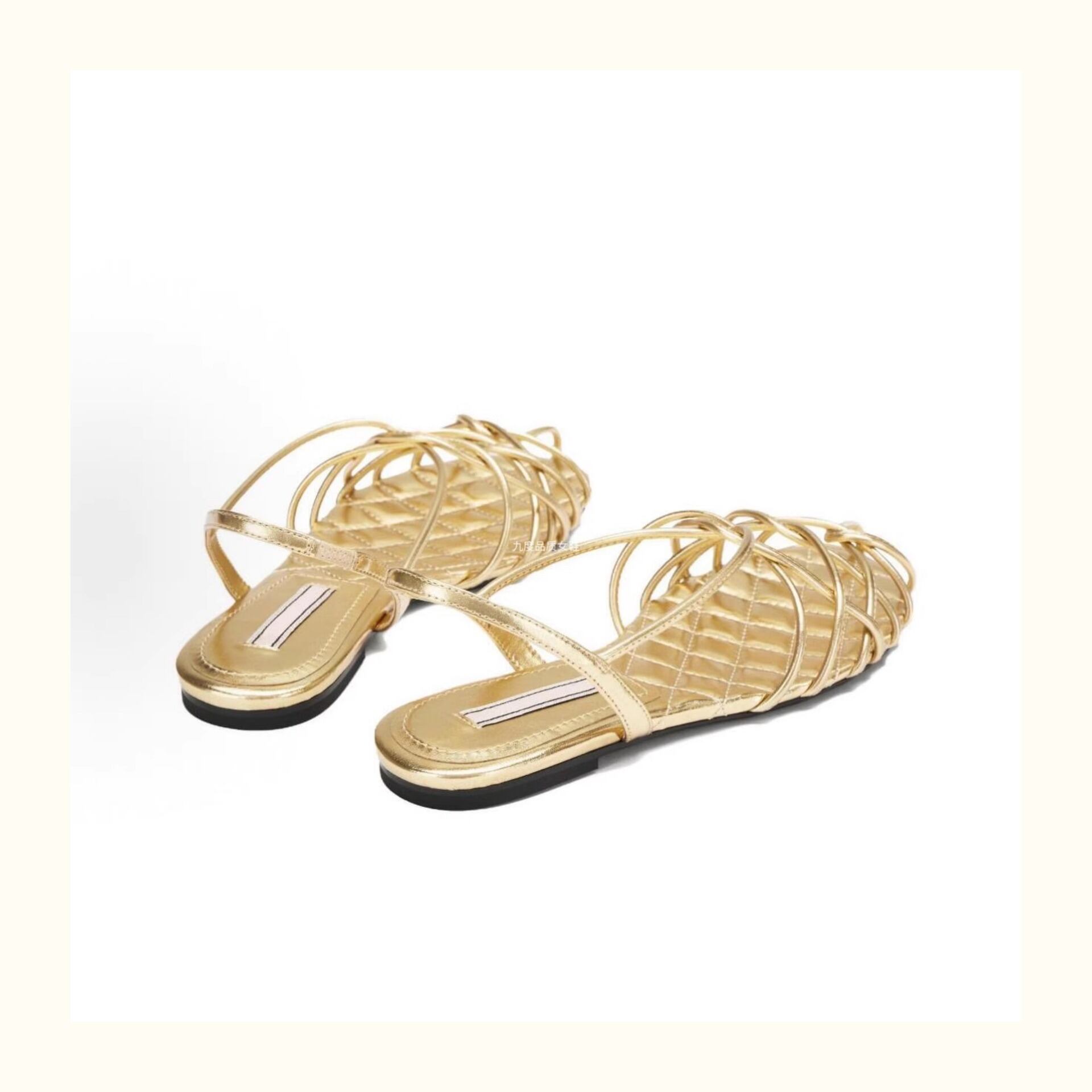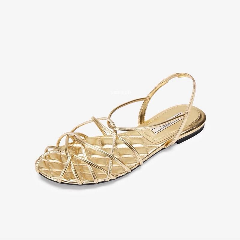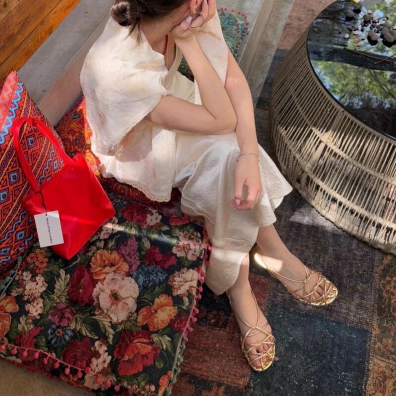 太めシルエットの大人可愛いぺたんこあみあみサンダル。
