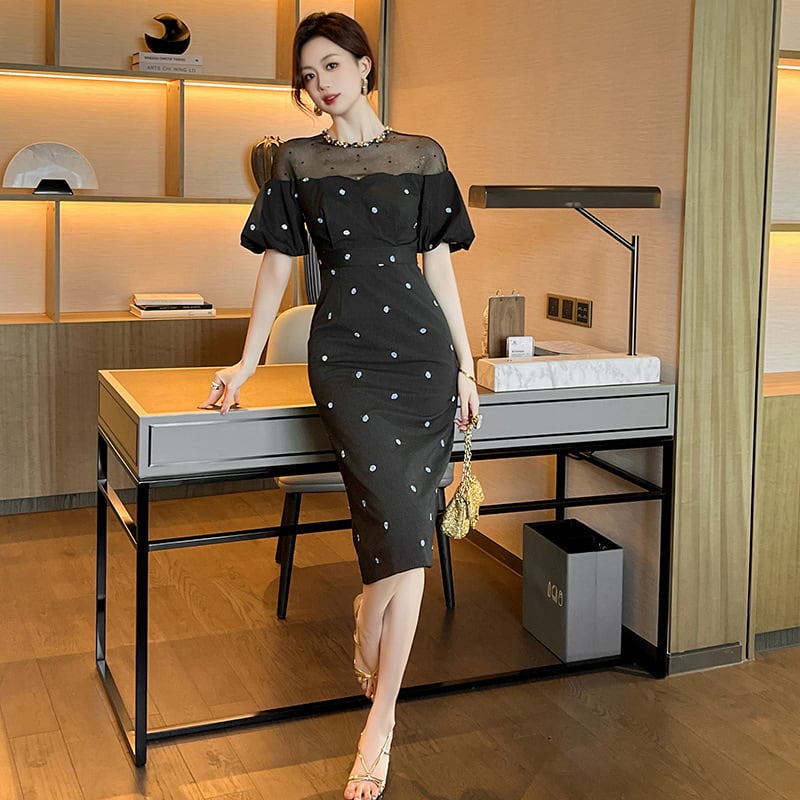 大人可愛いドット柄のタイトシルエットパーティードレス。