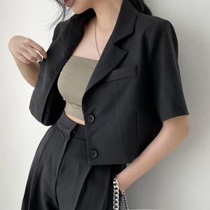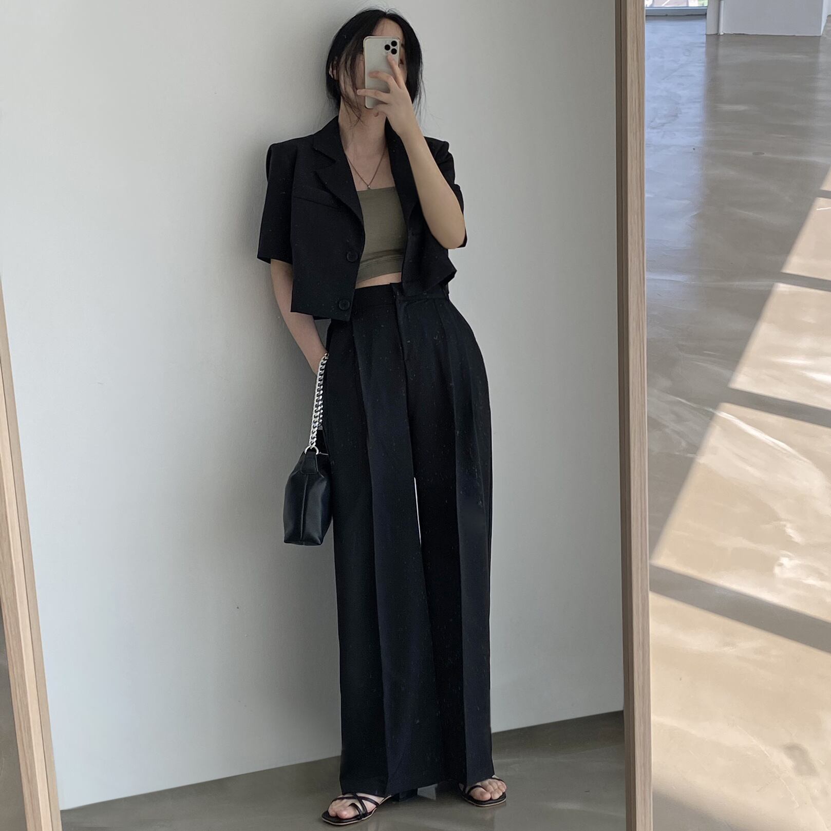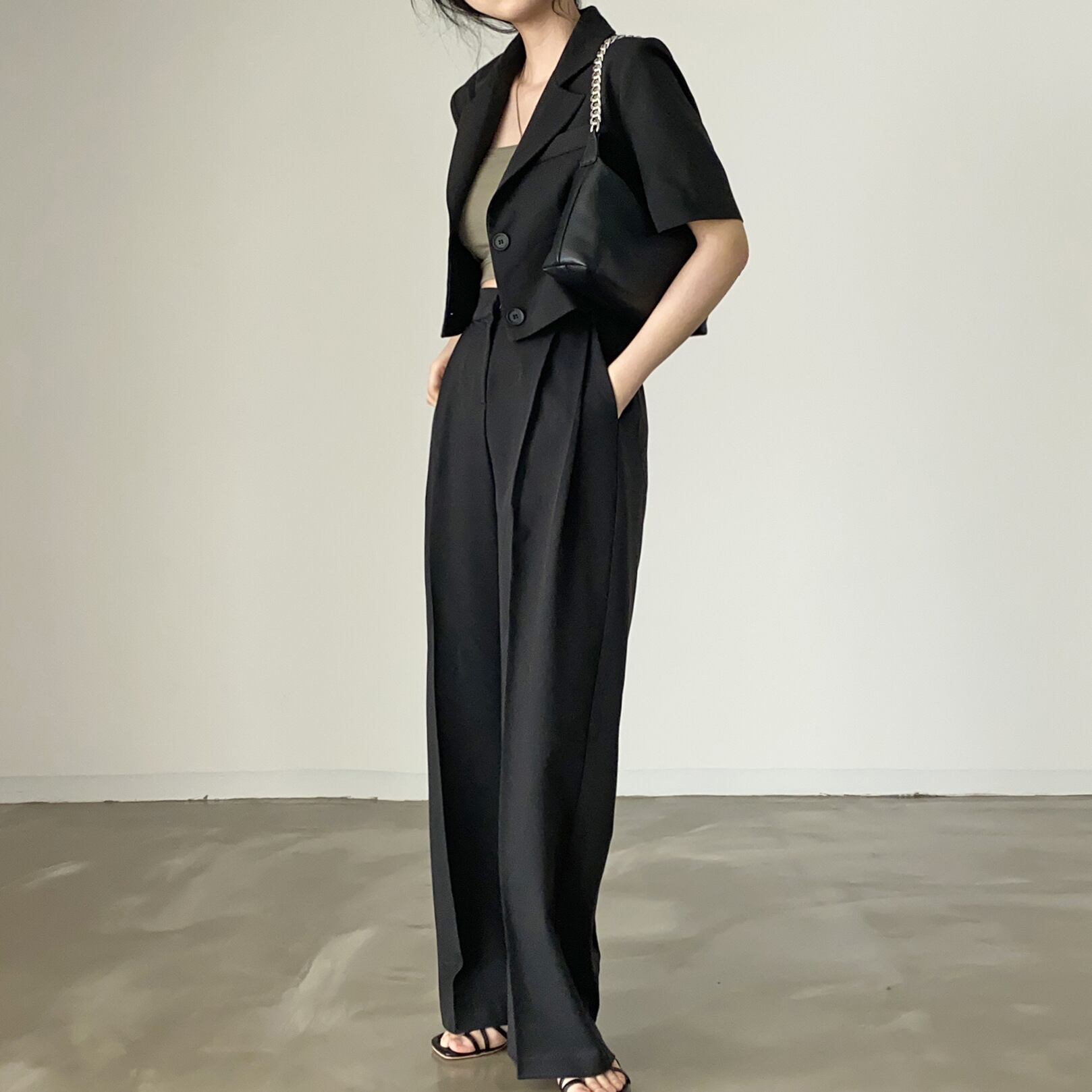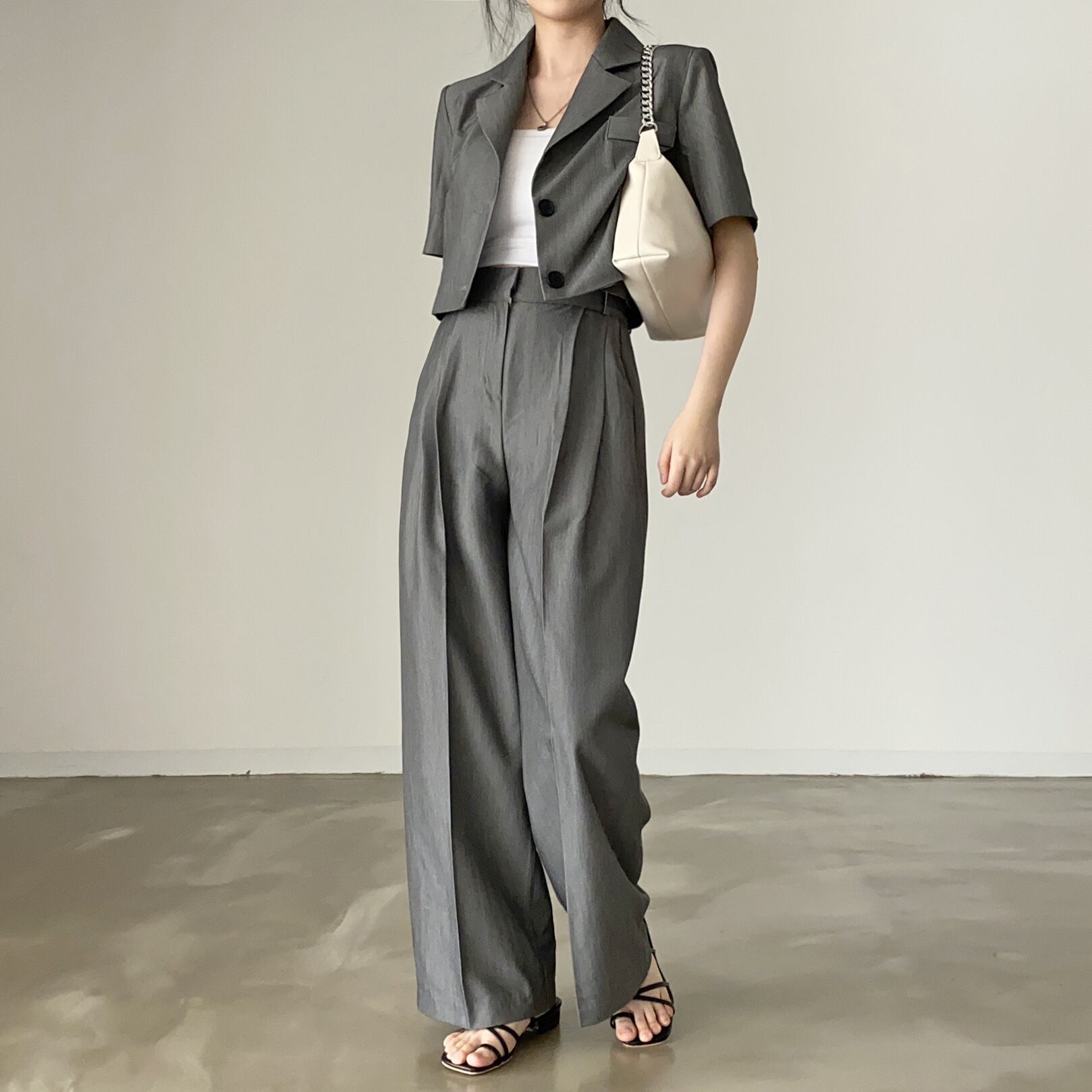 クロップド丈のトップス+ハイウエストパンツでスタイルアップ効果も。