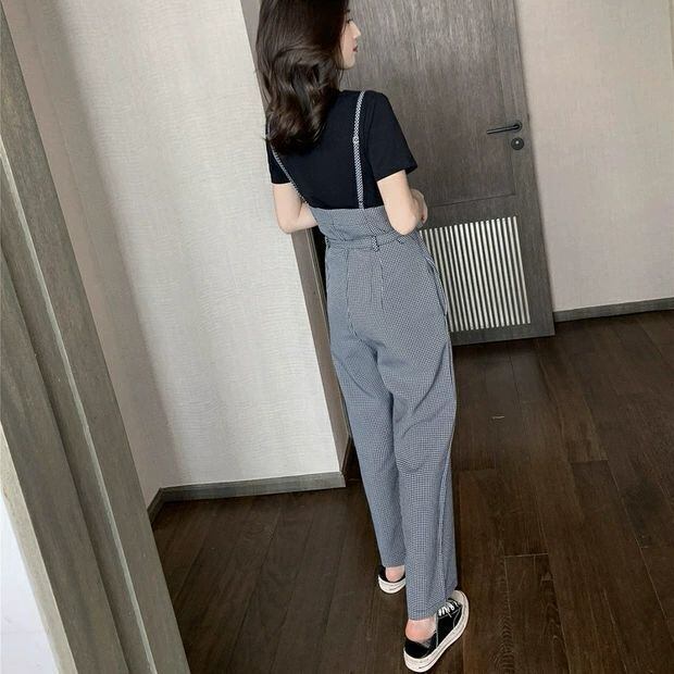 大人可愛いカットソー+千鳥格子のサロペットのセットアップ。