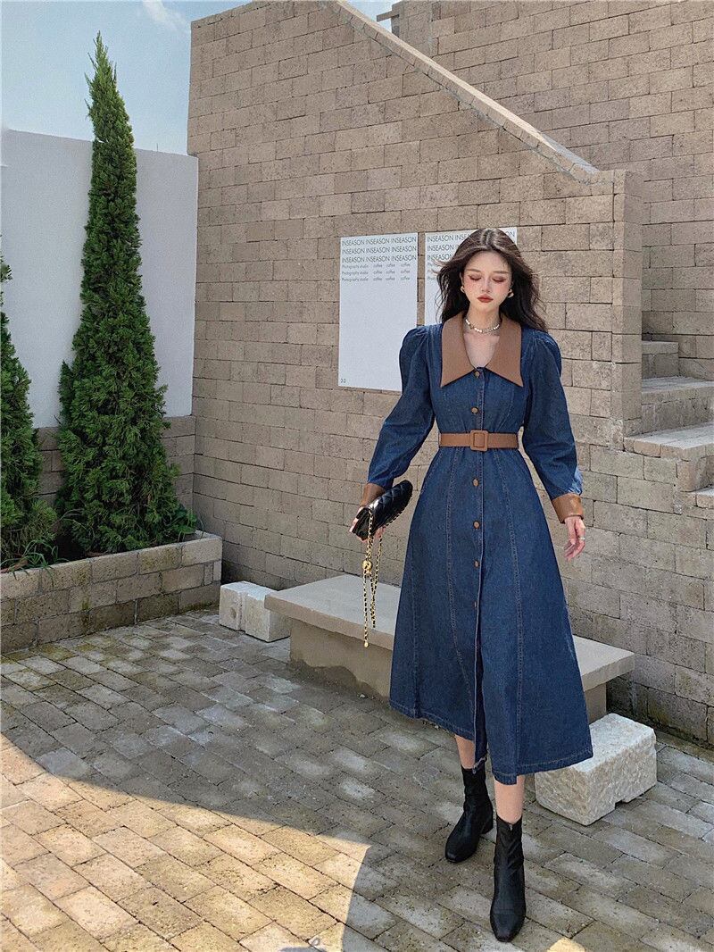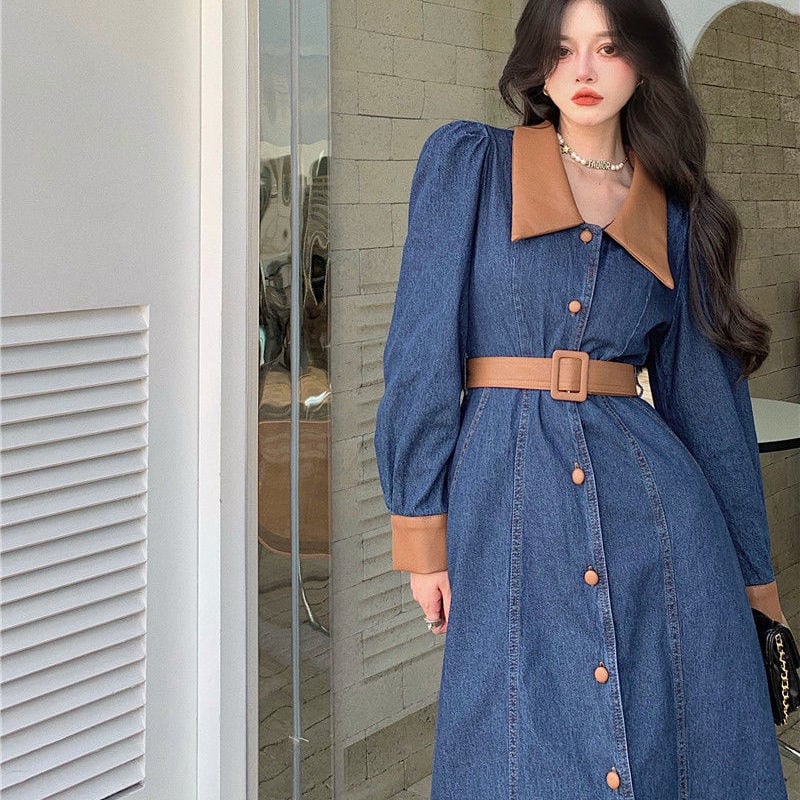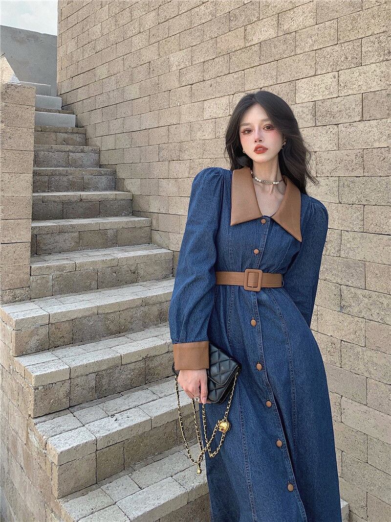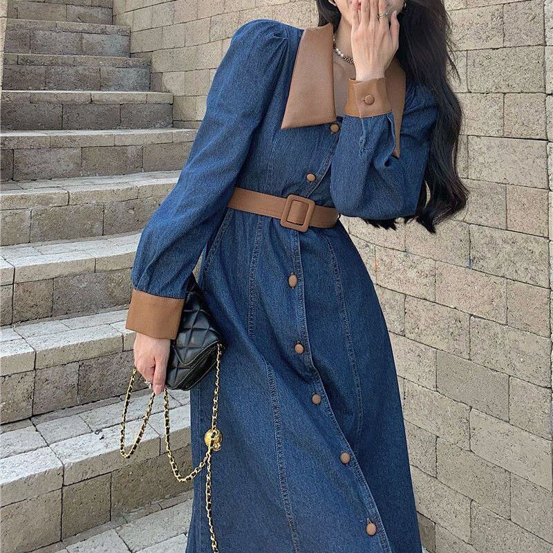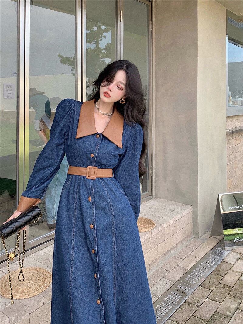 【ワンピース】大きいサイズ ワンピース レディース おしゃれ きれいめ 可愛い 春 夏 秋 デニム ワンピース 20代 30代 40代 ミモレ ワンピース 春秋 袖あり 韓国 ワンピース ネイビー 青 S M L XL 2XL 3XL 4XL 5XL