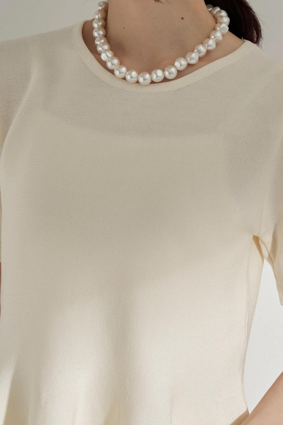 五分袖とペプラムでナチュラルに二の腕とお腹まわりをカバー。