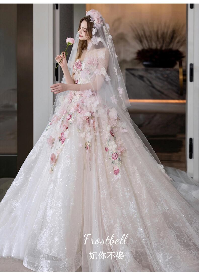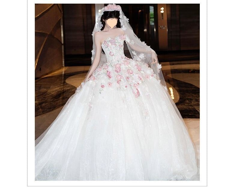 立体のお花刺繍が大人可愛いプリンセスラインのウェディングドレス。