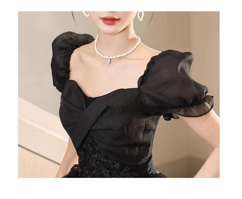 ボリューミーなお袖とふんわりとしたチュールスカートが女性らしさに華を添える。