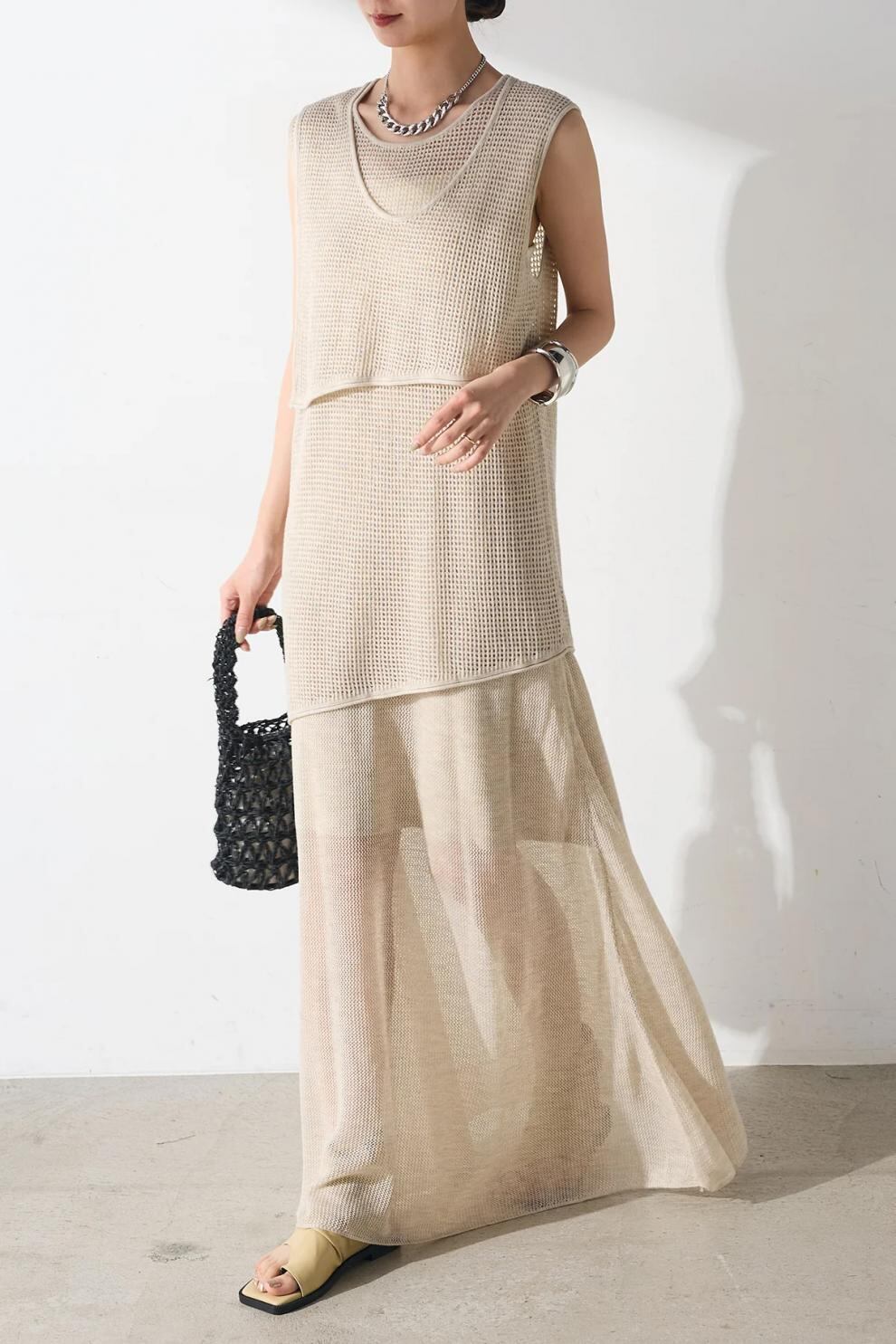 アシンメトリーな切り替えがエレガントなニットトップス+スカートのセットアップ。