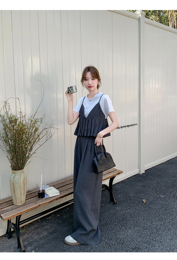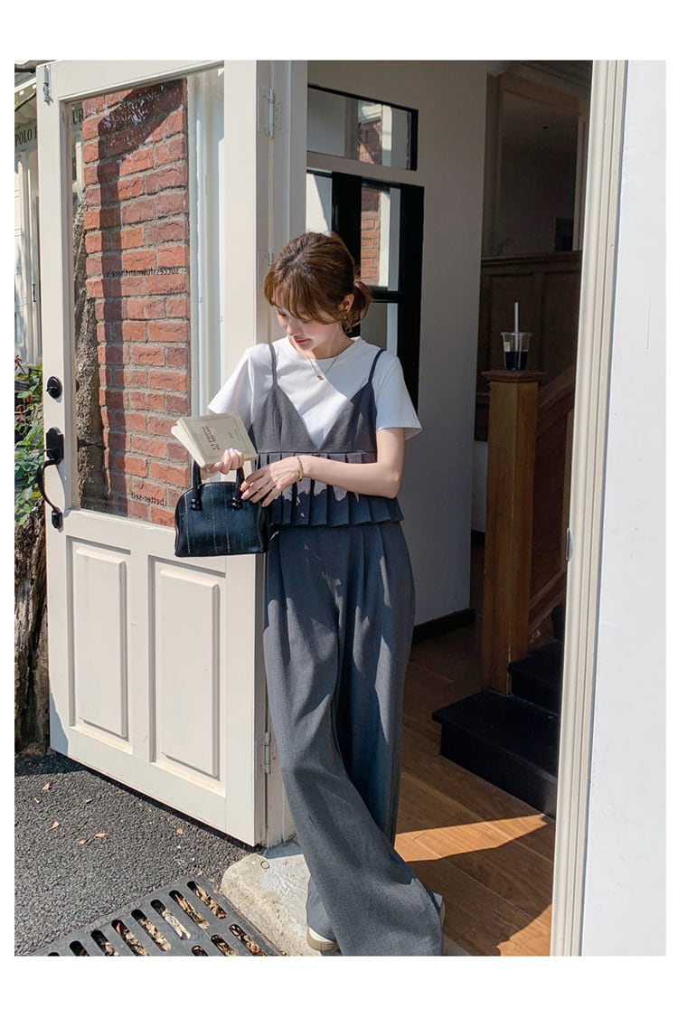 ベストの深いvネック&バックのフリル使いが可愛らしくポイントに。