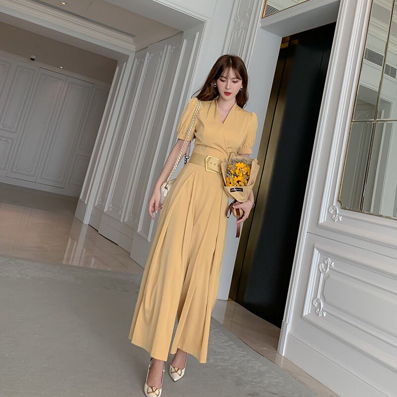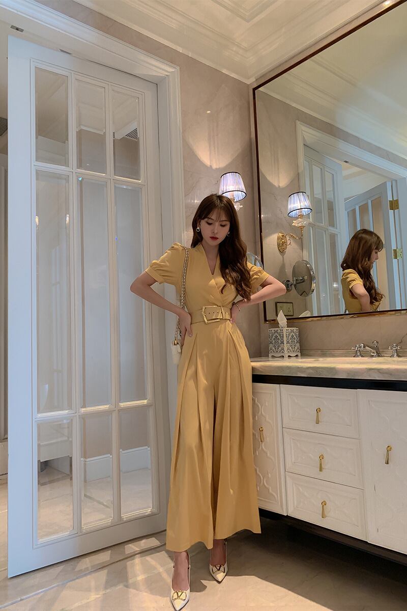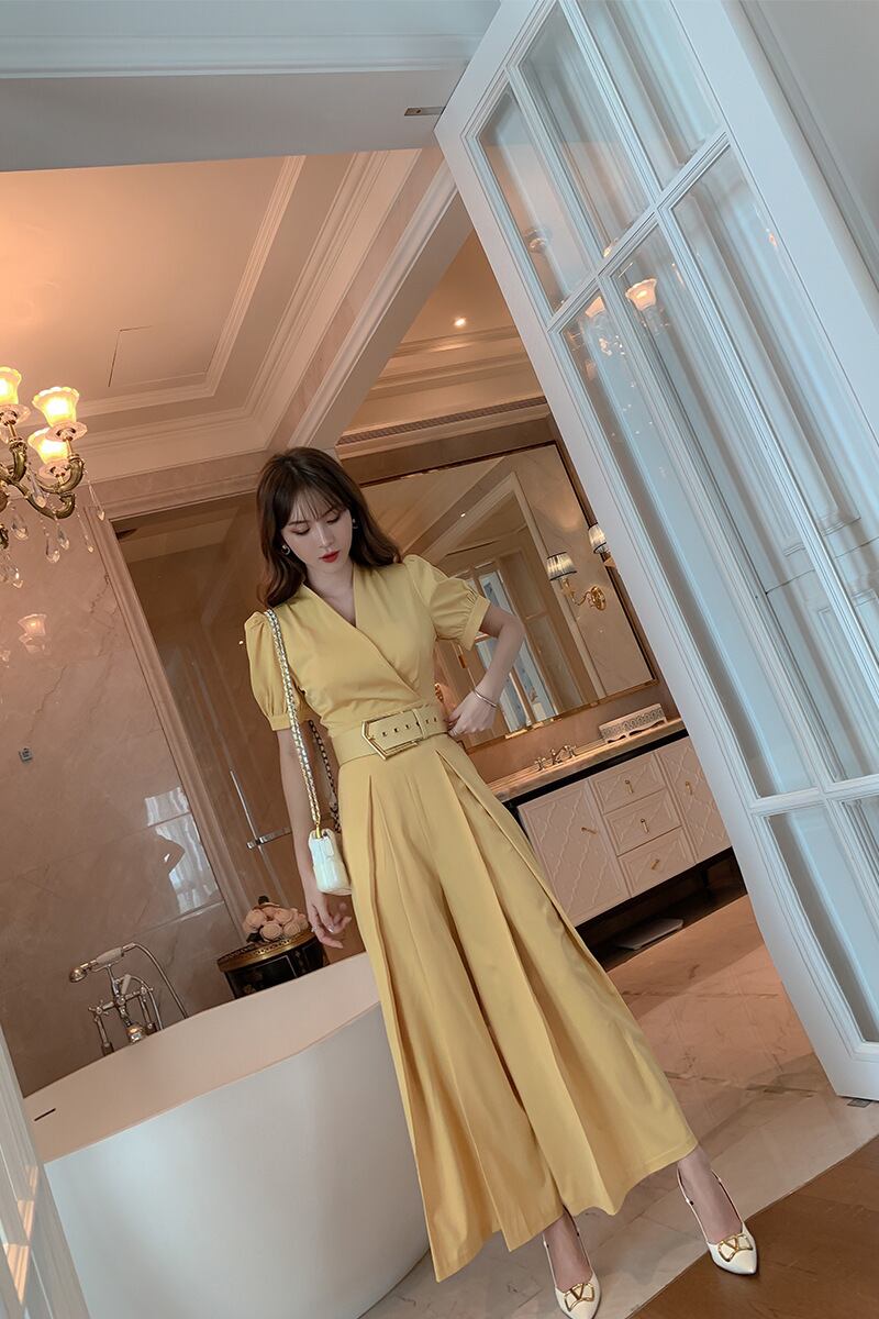 大人エレガントでラブリーなイエローカラーのパンツドレス。