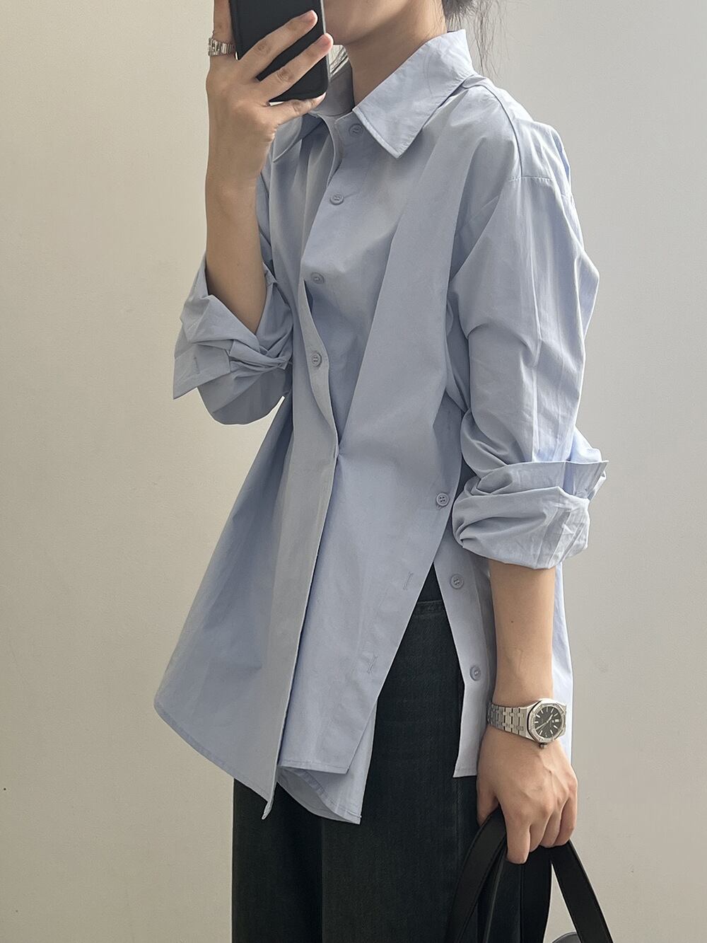 大人カジュアルなサイドスリットのななめボタンシャツ。