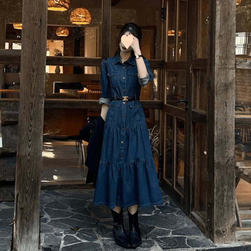 【ワンピース】 ワンピース レディース おしゃれ きれいめ 可愛い 春 秋 冬 ワンピース 20代 30代 40代 ロング ワンピース 春秋 袖あり 韓国 ワンピース デニム ダークブルー 青 S M L XL