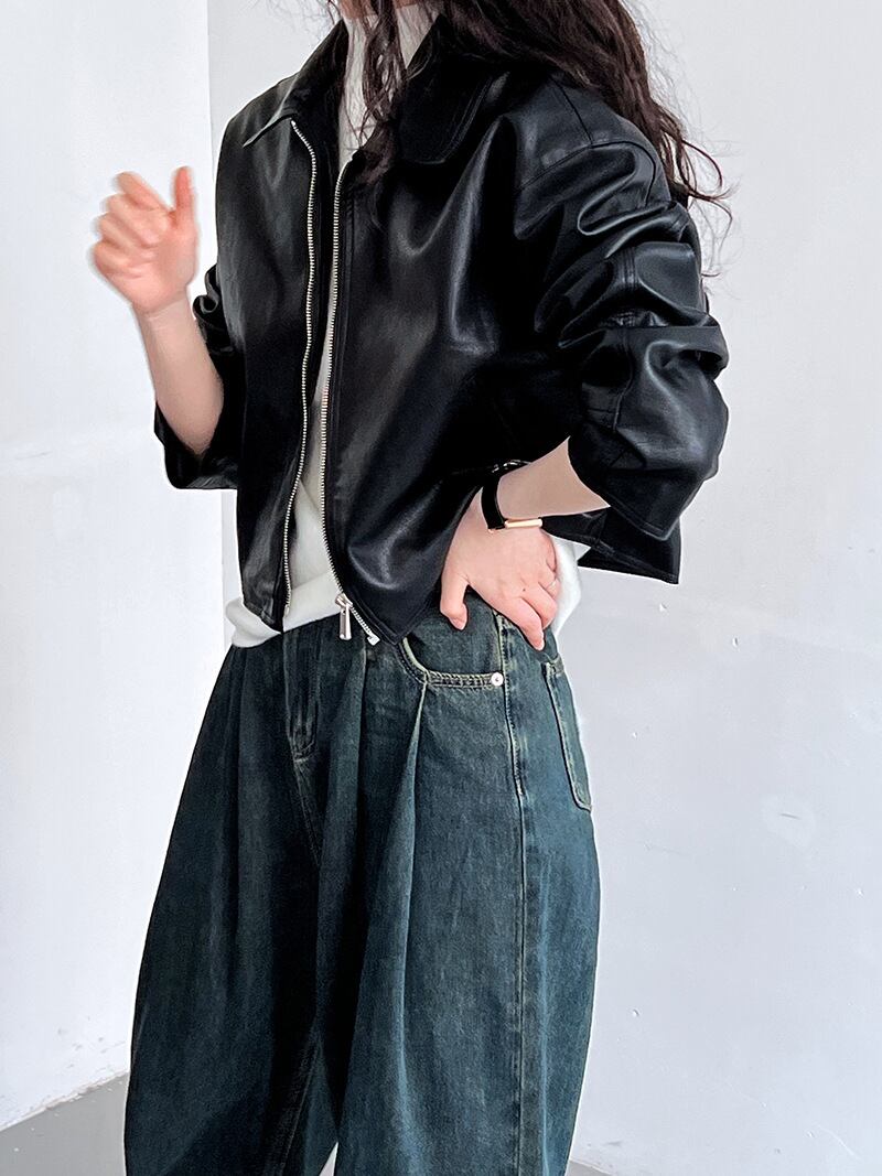 きれいめに着こなせる大人可愛いフェイクレザージャケット。