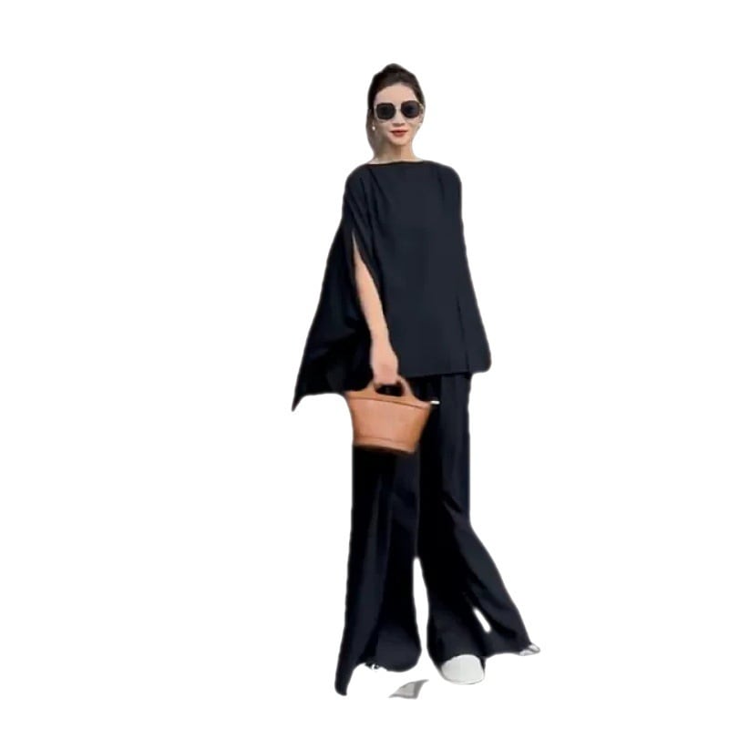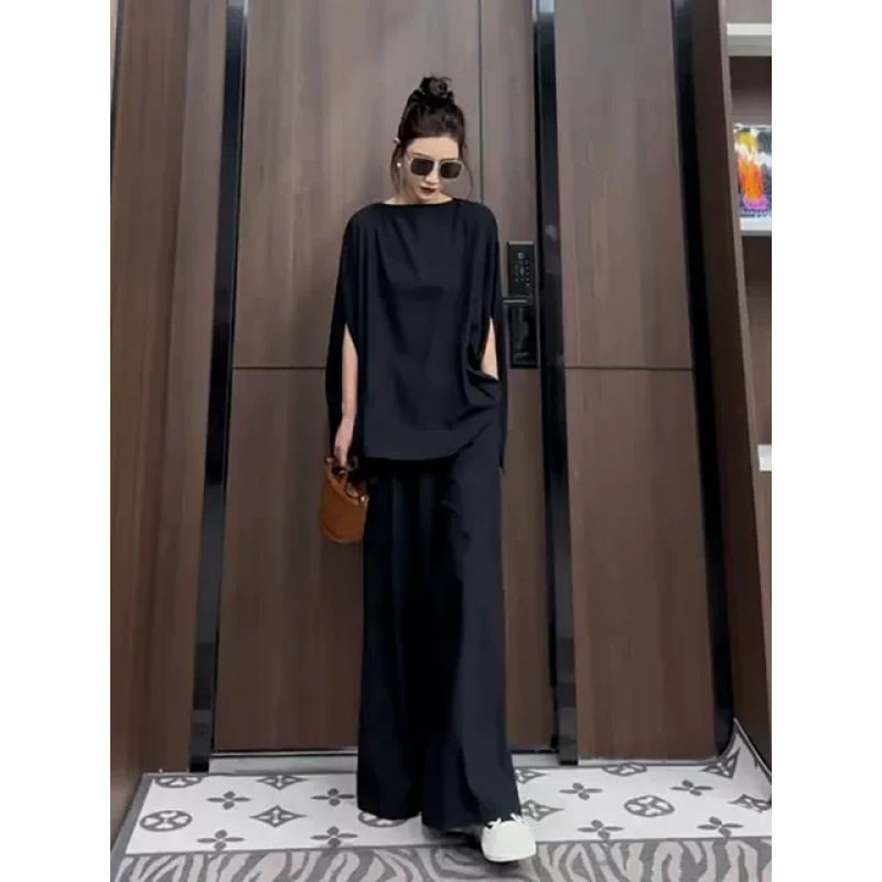 ワイドレッグパンツで足のラインをひろわずすっきりと落ちるシルエットで美脚効果も。