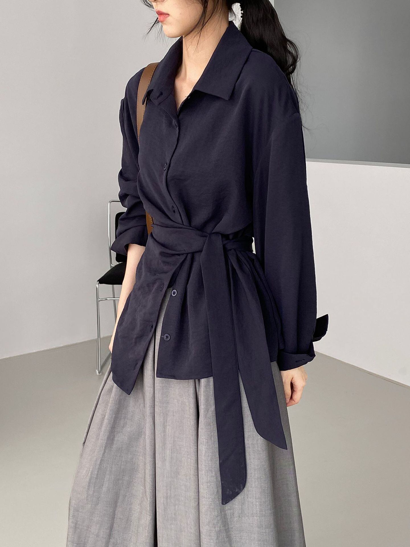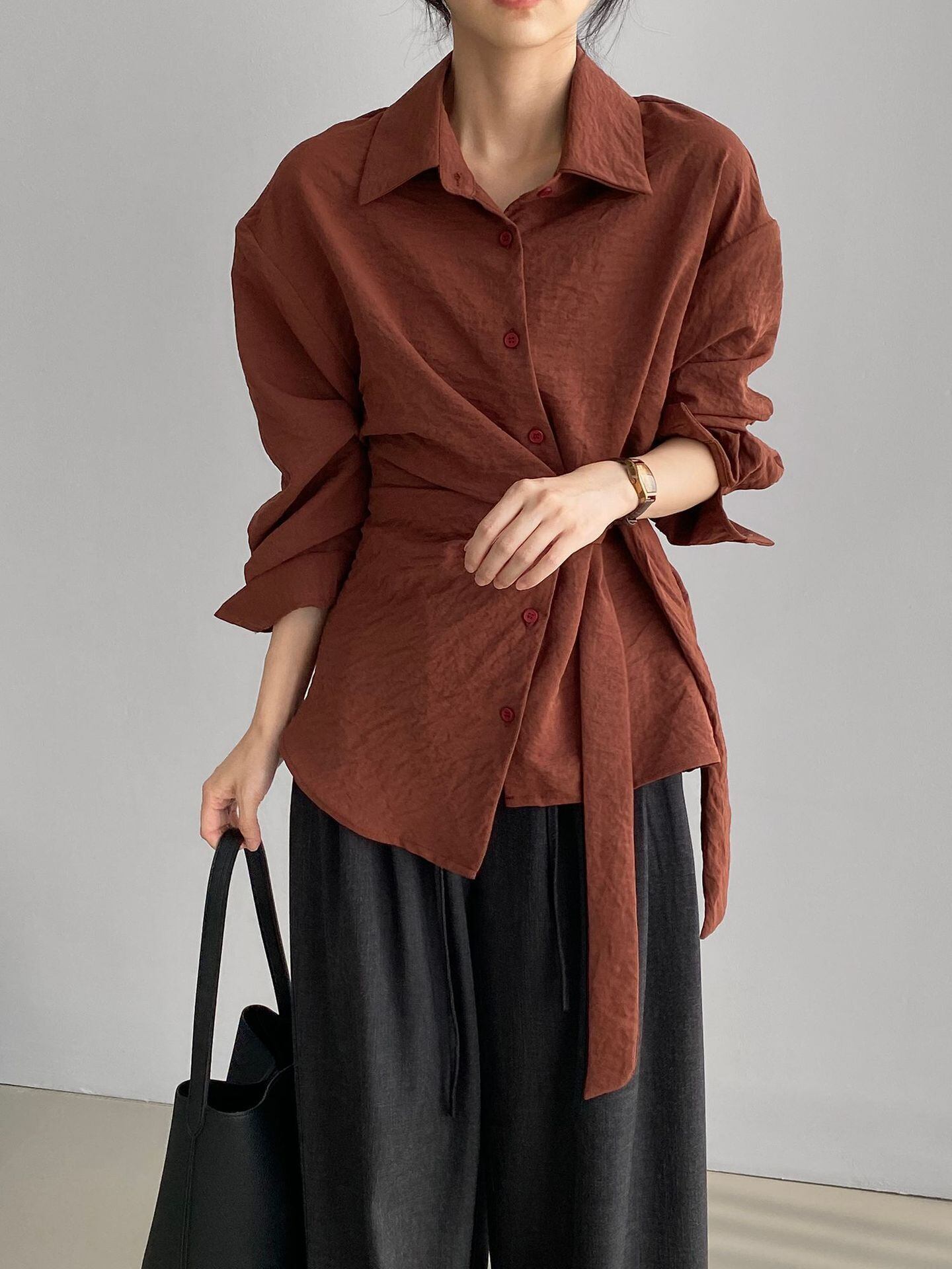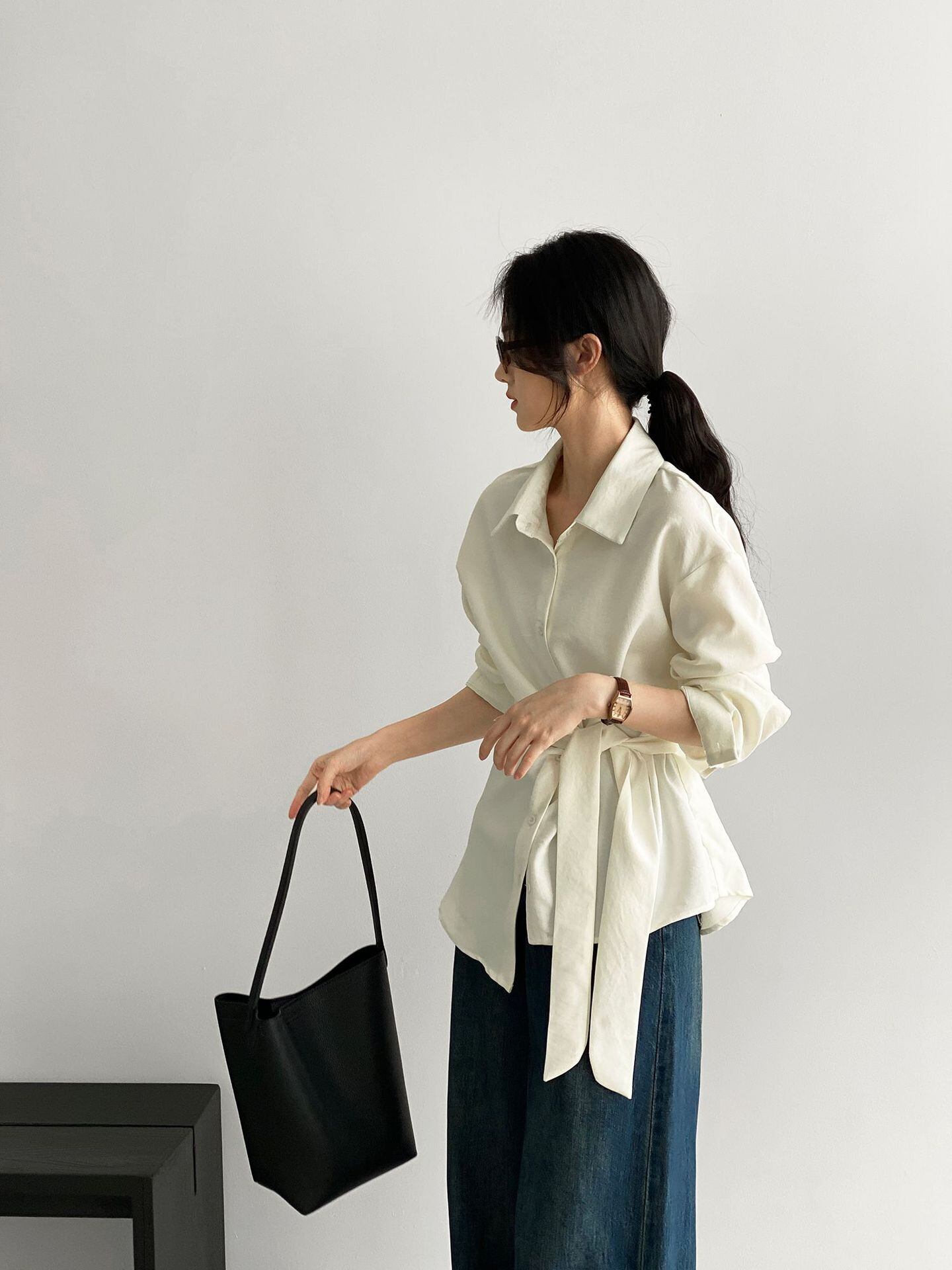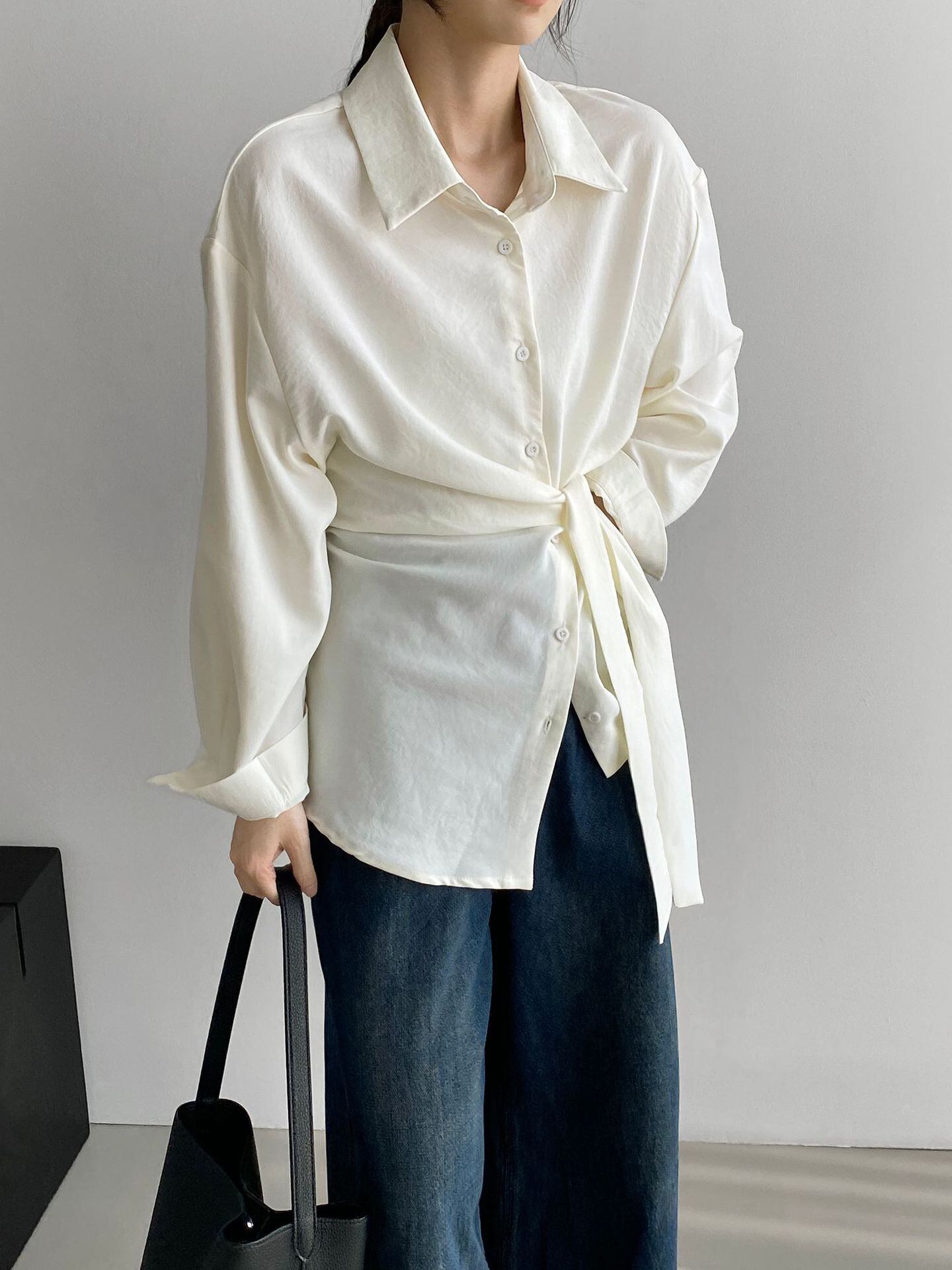 アシンメトリーデザインとウエストのリボンと絞りで細見え効果絶大なブラウス。