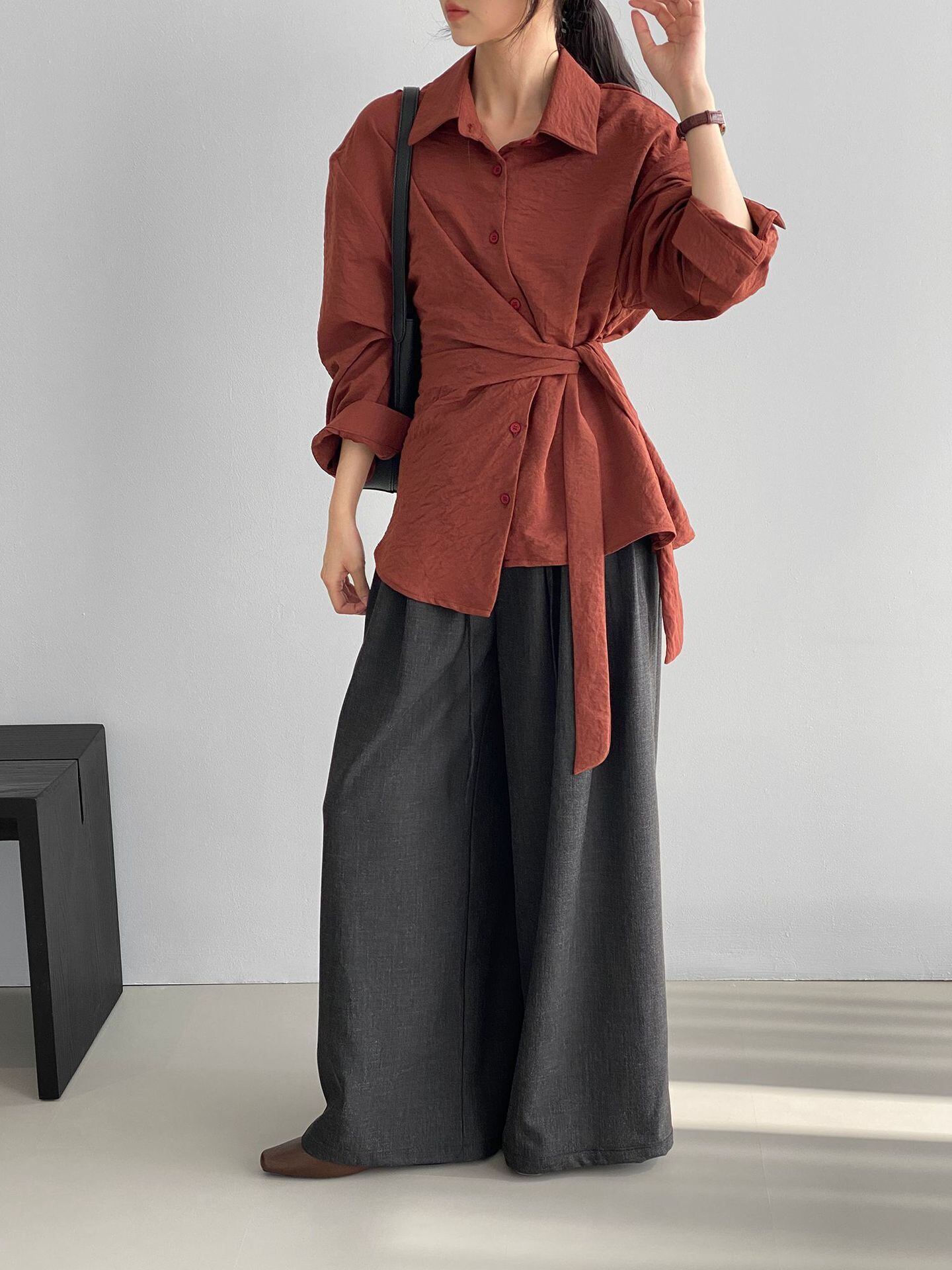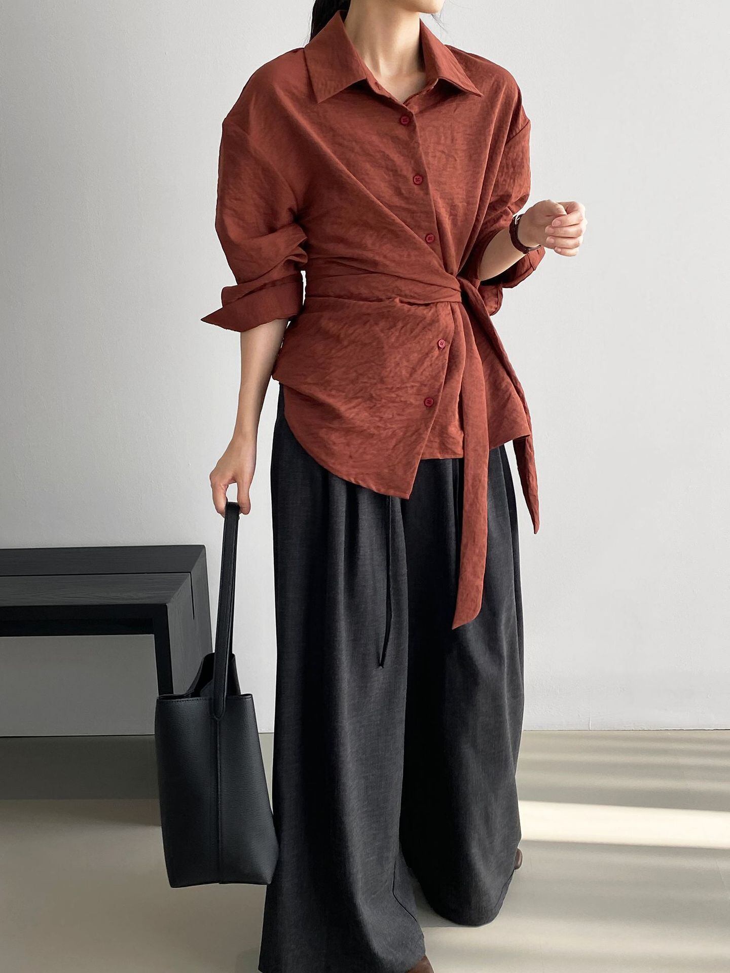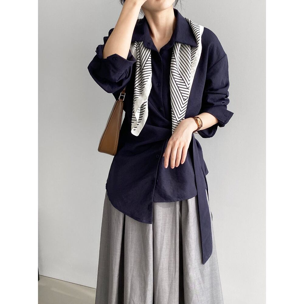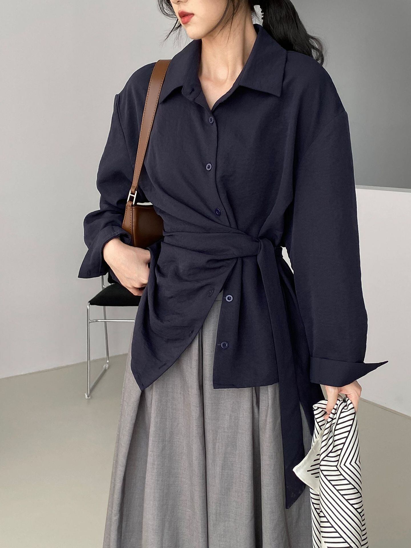アシンメトリーデザインとウエストのリボンと絞りで細見え効果絶大なブラウス。