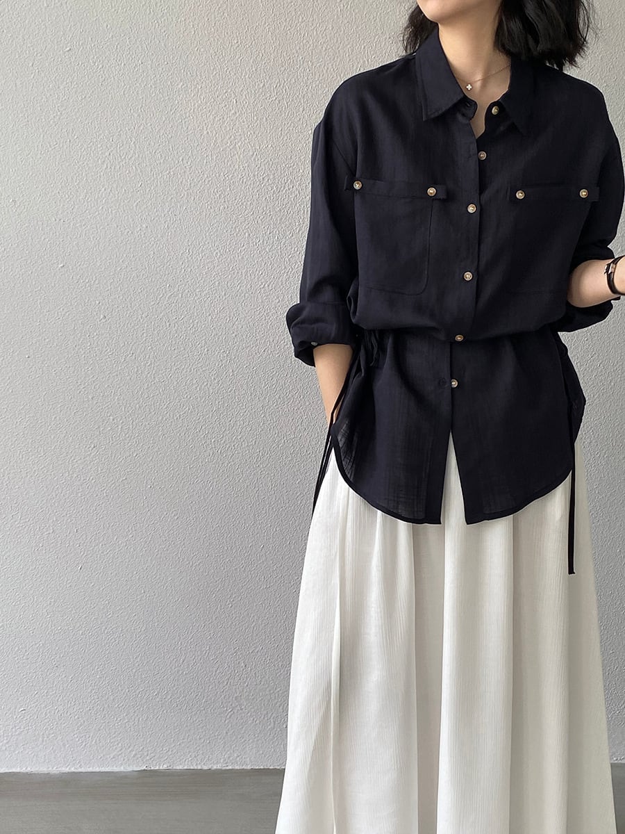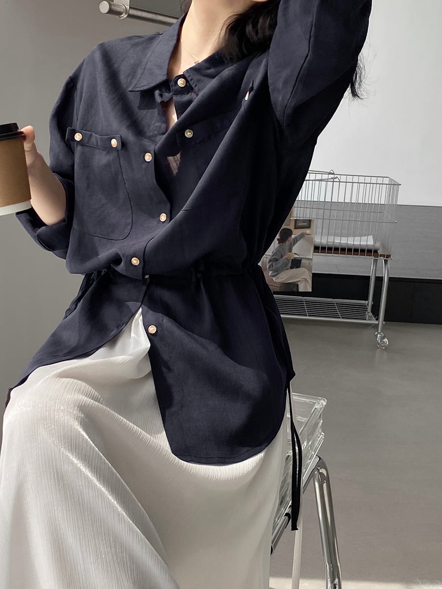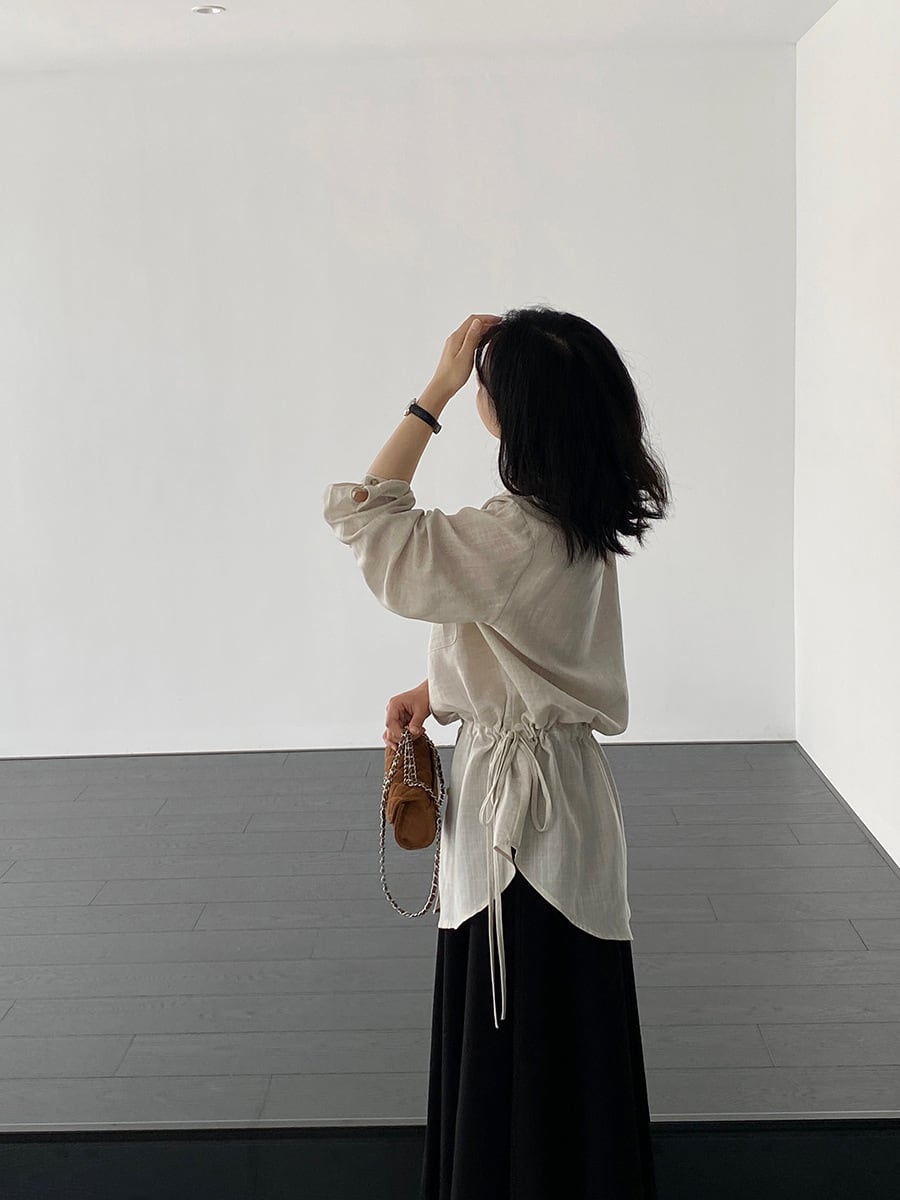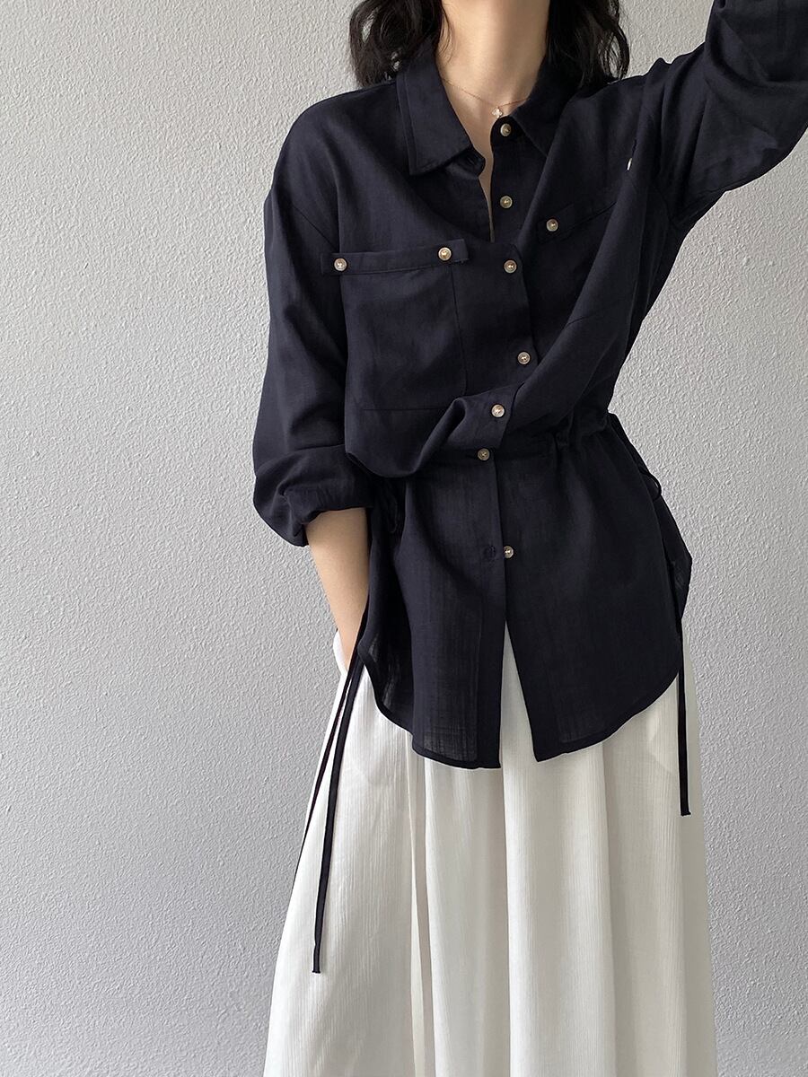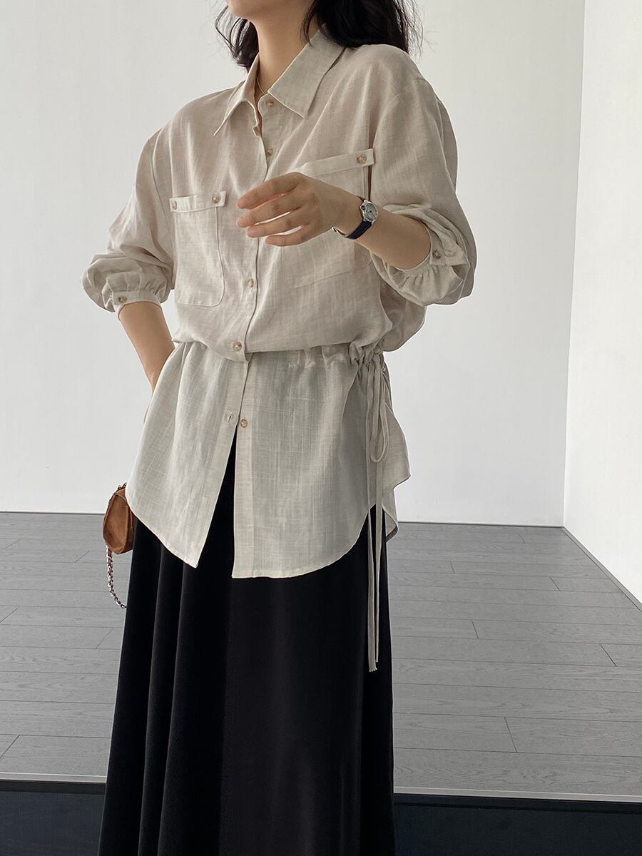 ウエストのドロストでウエストが絞れる細見え効果絶大なブラウス。