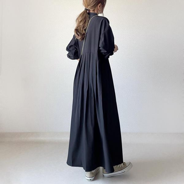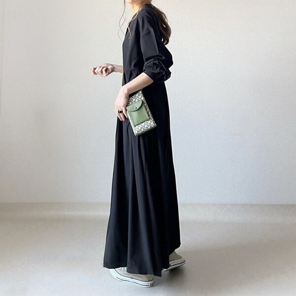 ハイウエストのプリーツでナチュラルにお腹まわりをカバーするワンピース。