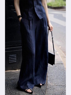大人エレガントなピンストライプ柄のパンツドレス。