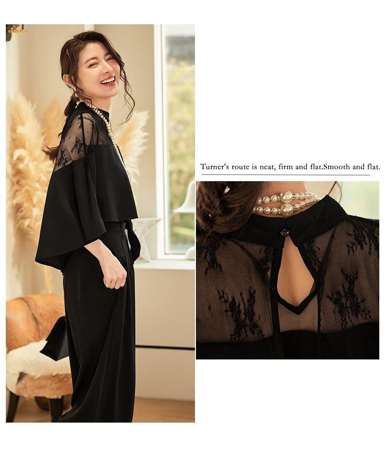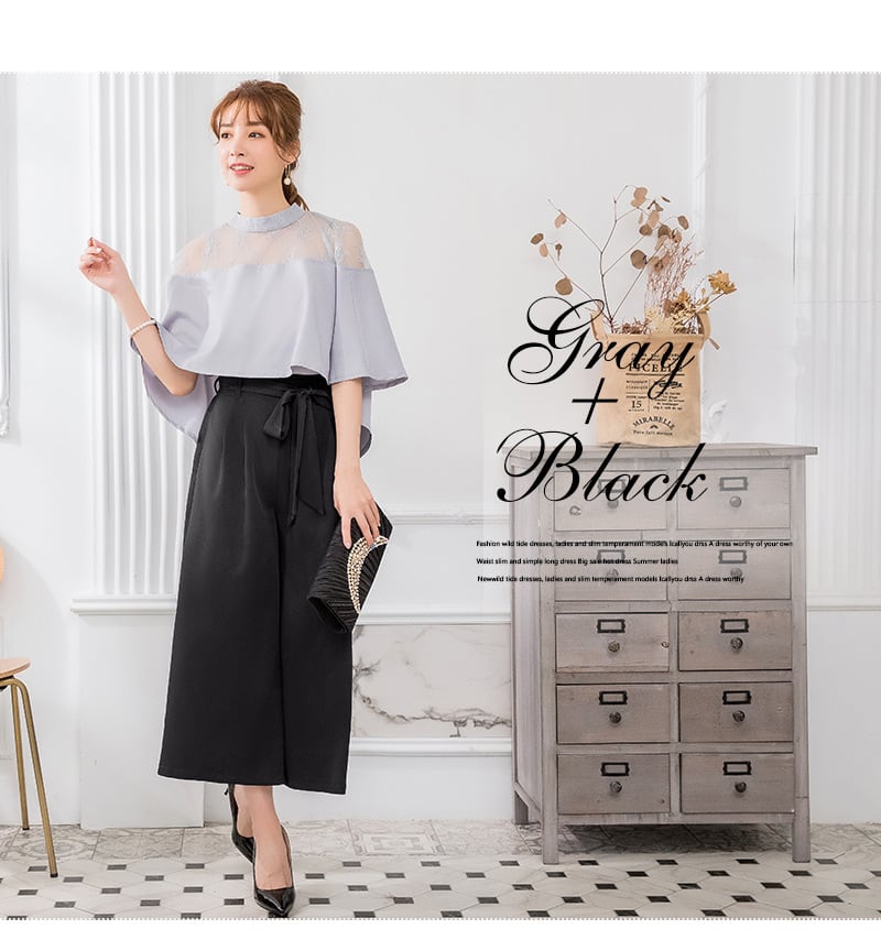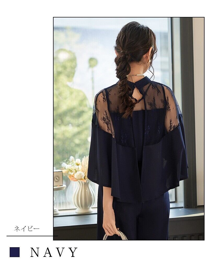 ケープ風のお袖が印象的なバイカラーのパンツドレス。