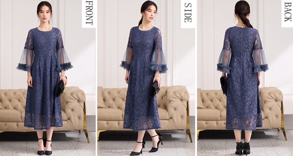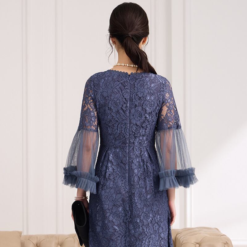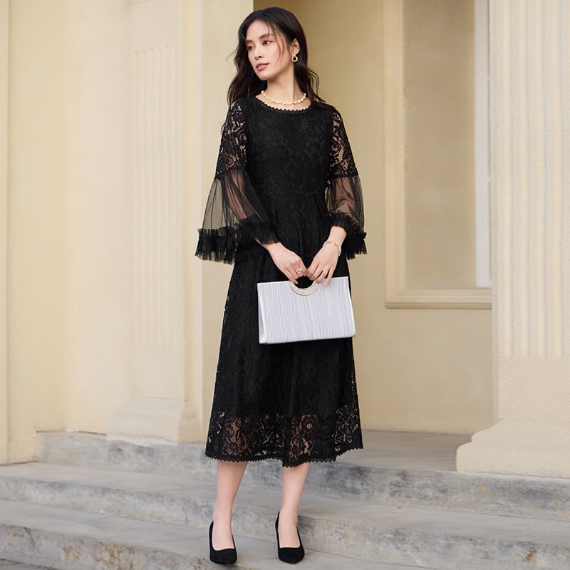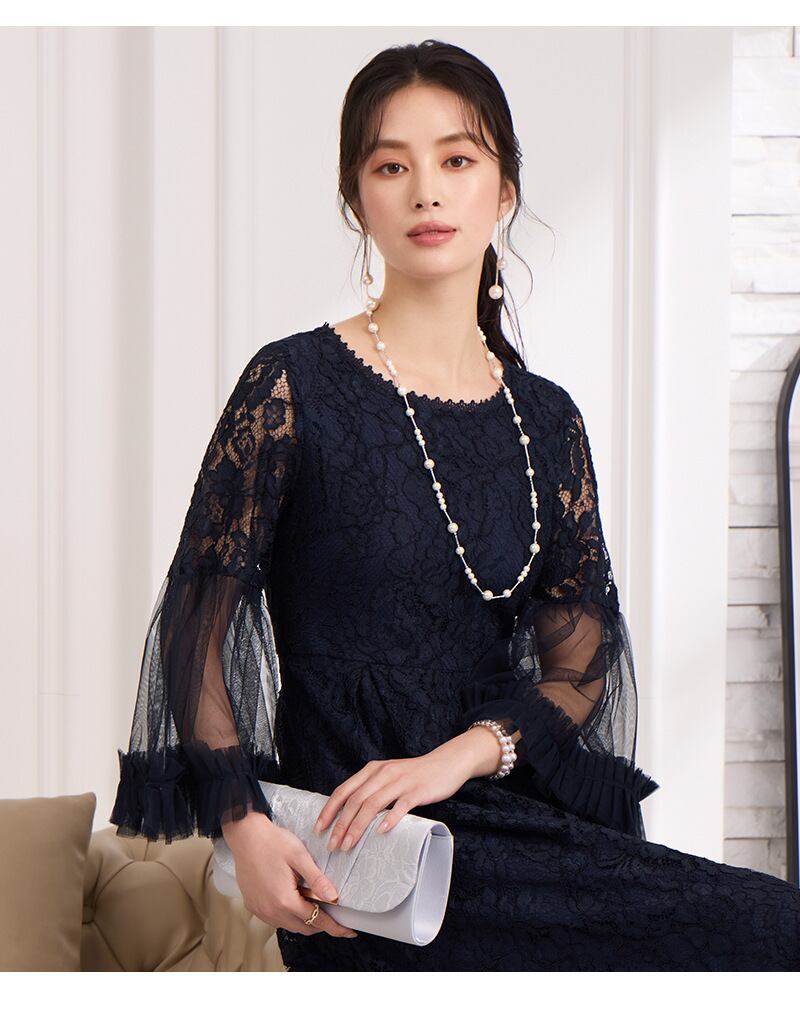 レーシィなお袖が印象的な総レースのパーティードレス。