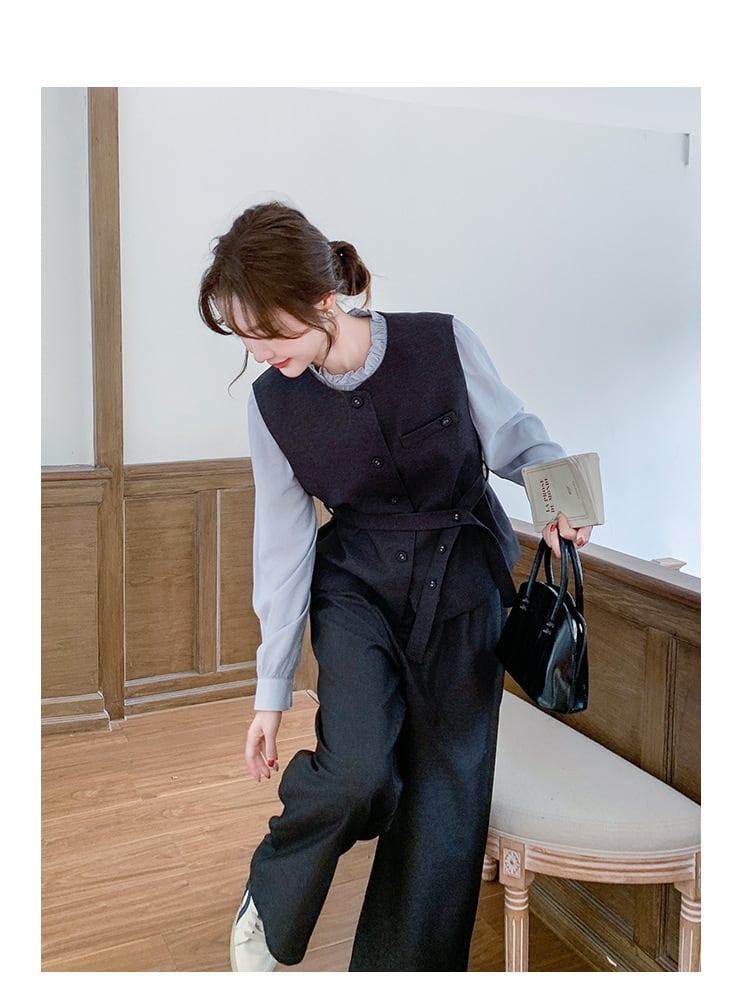 大人可愛いジレ+ブラウス+ワイドパンツのセットアップ。